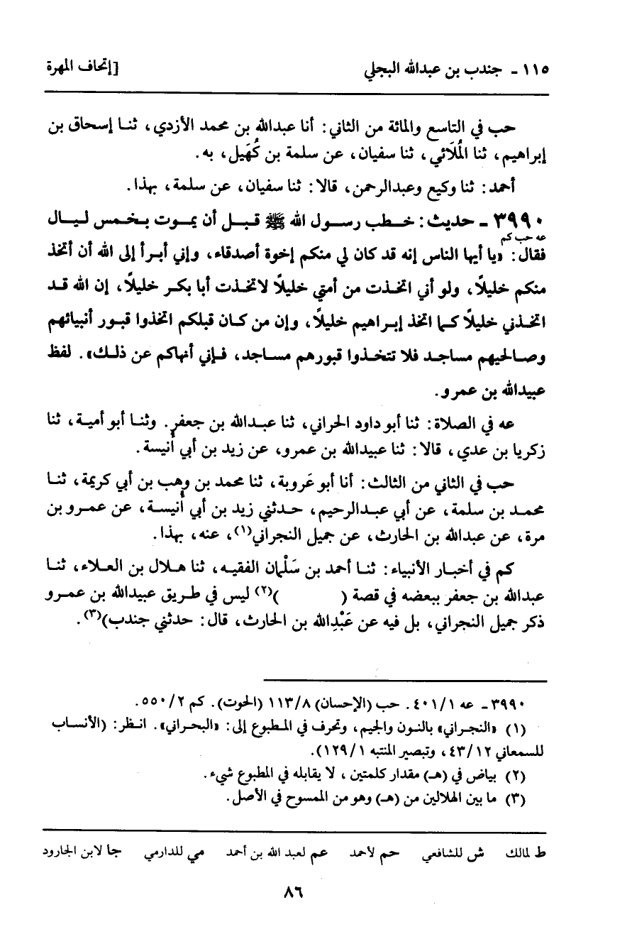 3990 - حَدِيثٌ (عه حب كم) : " خَطَبَ رَسُولُ اللَّهِ صَلَّى اللَّهُ عَلَيْهِ وَسَلَّمَ قَبْلَ أَنْ يَمُوتَ بِخَمْسِ لَيَالٍ: " يَأَيُّهَا النَّاسُ إِنَّهُ قَدْ كَانَ لِي مِنْكُمْ إِخْوَةٌ أَصْدِقَاءُ، وَإِنِّي أَبْرَأُ إِلَى اللَّهِ أَنْ أَتَّخِذَ مِنْكُمْ خَلِيلا، وَلَوْ أَنِّي اتَّخَذْتُ مِنْ أُمَّتِي خَلِيلا لاتَّخَذْتُ أَبَا بَكْرٍ خَلِيلا، إِنَّ اللَّهَ قَدِ اتَّخَذَنِي خَلِيلا كَمَا اتَّخَذَ إِبْرَاهِيمُ خَلِيلا، وَإِنَّ مَنْ كَانَ قَبْلَكَ اتَّخَذُوا قُبُورَ أَنْبِيَائِهِمْ وَصَالِحِيهِمْ مَسَاجِدَ فَلا تَتَّخِذُوا قُبُورَهُمْ مَسَاجِدَ، فَإِنِّي أَنْهَاكُمْ عَنْ ذَلِكَ ". لَفْظُ عَبْدِ اللَّهِ بْنِ عَمْرٍو.