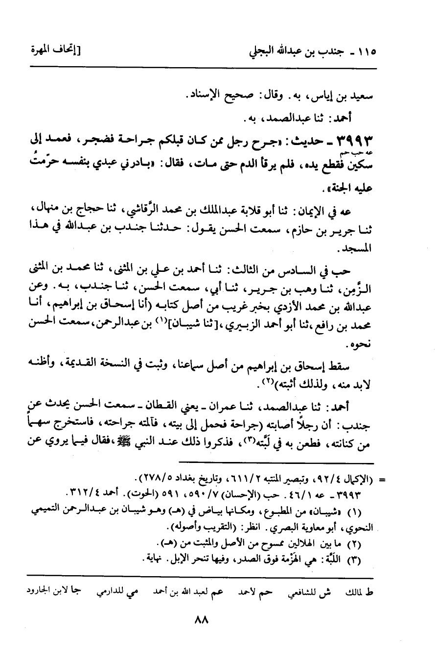 حب فِي السَّادِسِ مِنَ الثَّالِثِ: ثنا أَحْمَدُ بْنُ عَلِيِّ بْنِ الْمُثَنَّى، ثنا مُحَمَّدُ بْنُ الْمُثَنَّى الزَّمَنُ، ثنا وَهْبُ بْنُ جَرِيرٍ، ثنا أَبِي، سَمِعْتُ الْحَسَنَ، ثنا جُنْدُبٌ، بِهِ. وَعَنْ عَبْدِ اللَّهِ بْنِ مُحَمَّدٍ الأَزْدِيِّ بِخَبَرٍ غَرِيبٍ مِنْ أَصْلِ كِتَابِهِ، أنا إِسْحَاقُ بْنُ إِبْرَاهِيمَ، أنا مُحَمَّدُ بْنُ رَافِعٍ، ثنا أَبُو أَحْمَدَ الزُّبَيْرِيُّ، ثنا شَيْبَانُ بْنُ عَبْدِ الرَّحْمَنِ، سَمِعْتُ الْحَسَنَ نَحْوَهُ.