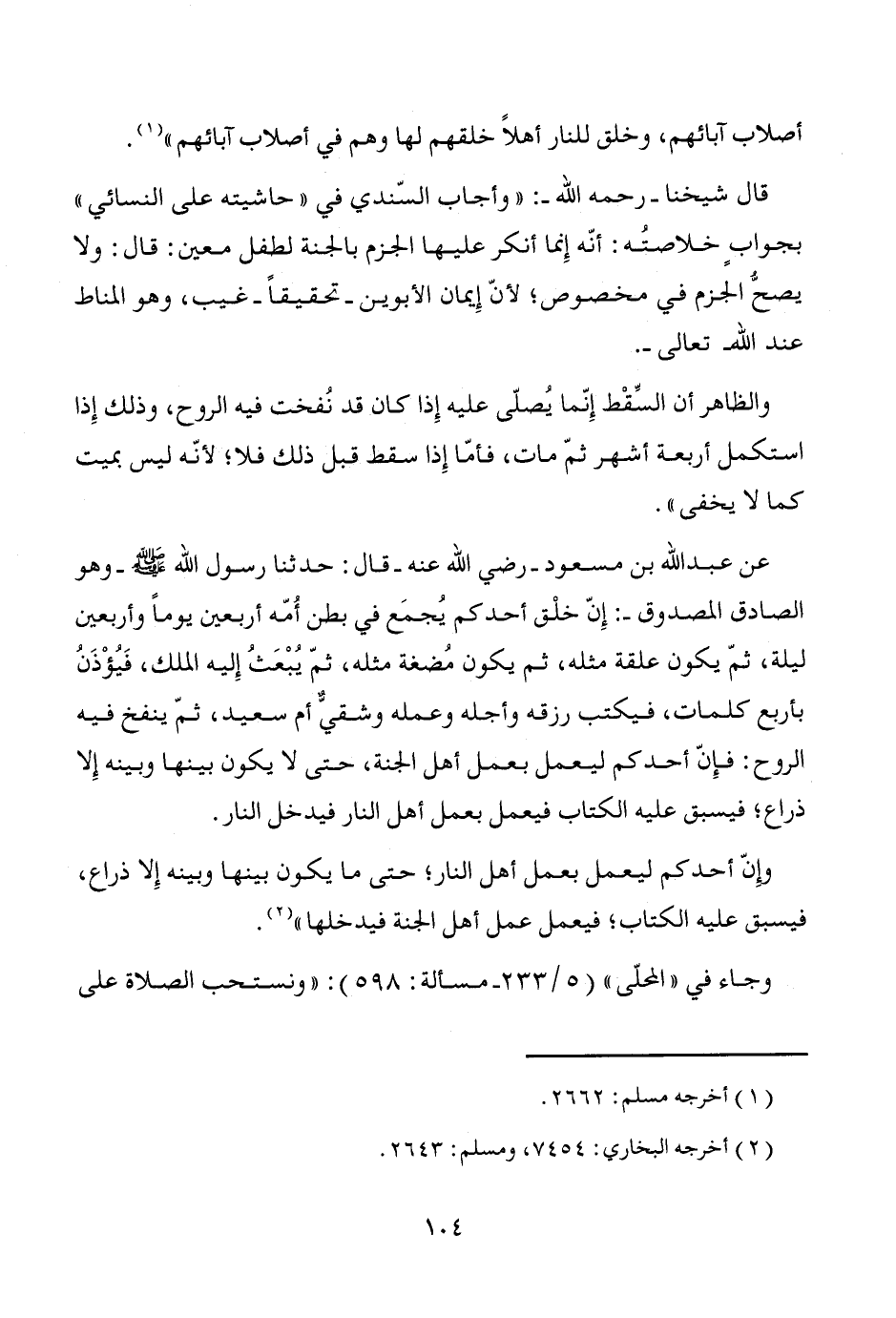 عن عبد الله بن مسعود -رضي الله عنه- قال: حدثنا رسول الله - صَلَّى اللَّهُ عَلَيْهِ وَسَلَّمَ -وهو الصادق المصدوق-: إِنّ خلْق أحدكم يُجمَع في بطن أُمّه أربعين يوماً وأربعين ليلة، ثمّ يكون علقة مثله، ثم يكون مُضغة مثله، ثمّ يُبْعَثُ إِليه الملك، فَيُؤْذَنُ بأربع كلمات، فيكتب رزقه وأجله وعمله وشقيٌّ أم سعيد، ثمّ ينفخ فيه الروح: فإِنّ أحدكم ليعمل بعمل أهل الجنة، حتى لا يكون بينها وبينه إلا ذراع؛ فيسبق عليه الكتاب فيعمل بعمل أهل النار فيدخل النار.