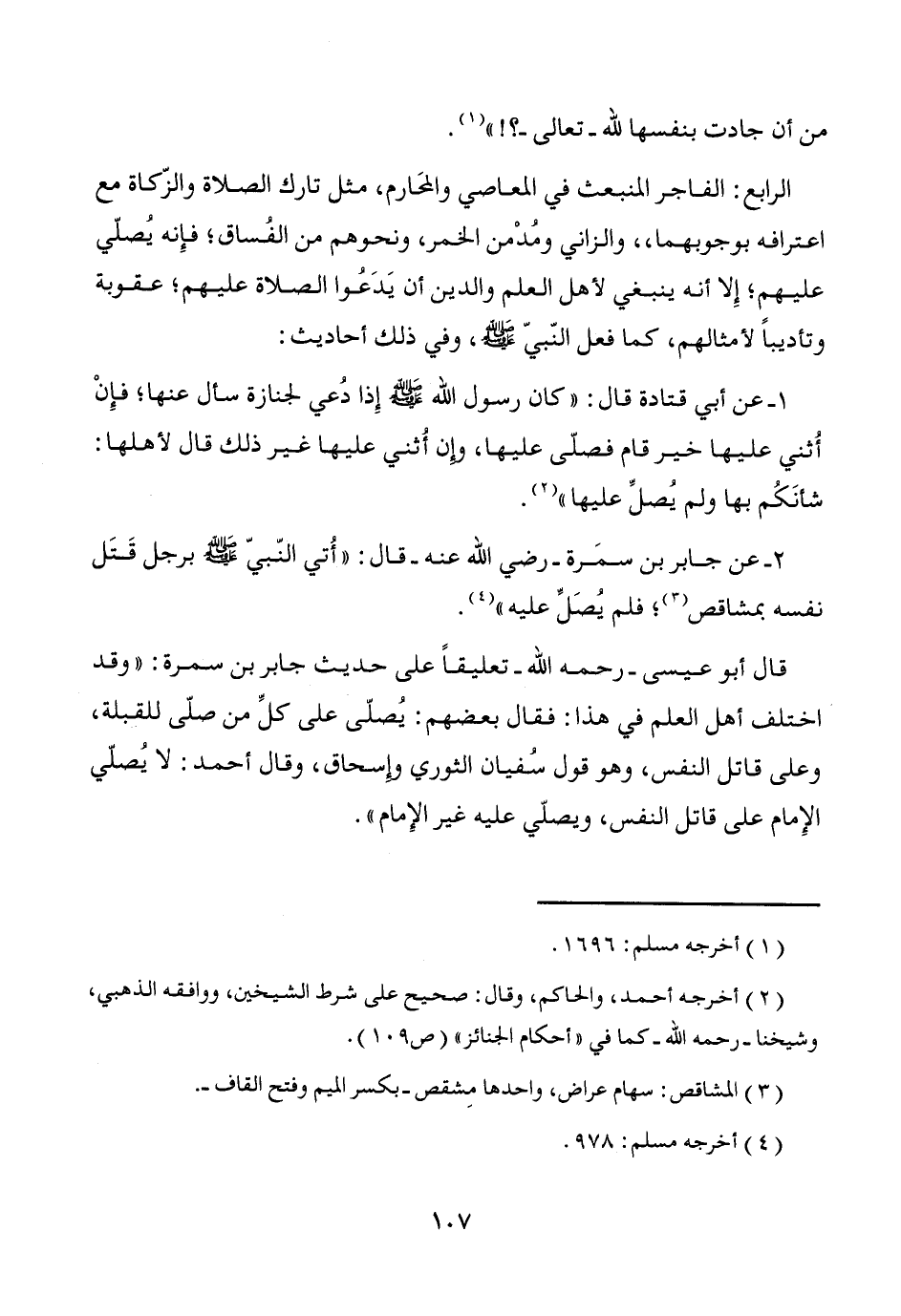 قال أبو عيسى -رحمه الله- تعليقاً على حديث جابر بن سمرة: "وقد اختلف أهل العلم في هذا: فقال بعضهم: يُصلّى على كلِّ من صلّى للقبلة، وعلى قاتل النفس، وهو قول سُفيان الثوري وإسحاق، وقال أحمد: لا يُصلّي الإِمام على قاتل النفس، ويصلّي عليه غير الإِمام".