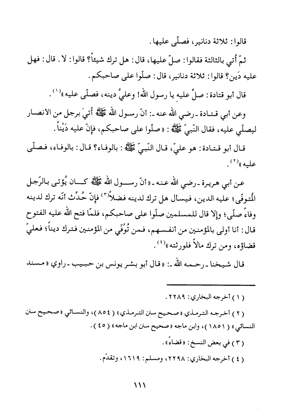وعن أبي قتادة -رضي الله عنه-: أنّ رسول الله - صَلَّى اللَّهُ عَلَيْهِ وَسَلَّمَ - أُتيَ برجل من الأنصار ليصلّي عليه، فقال النّبيّ - صَلَّى اللَّهُ عَلَيْهِ وَسَلَّمَ -: "صلّوا على صاحبكم، فإِنّ عليه دَيْناً.