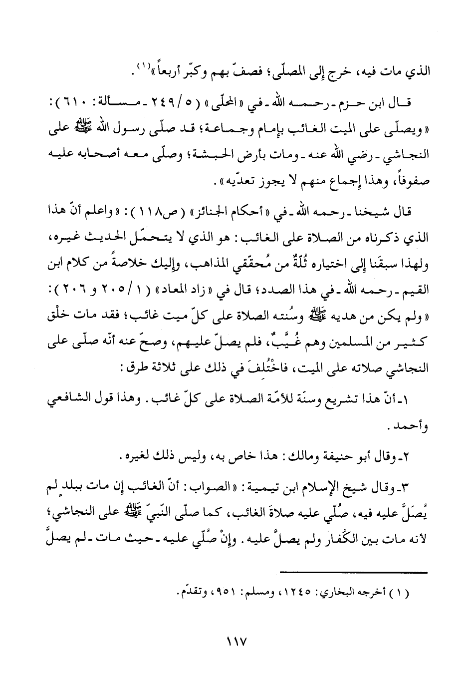 3 - وقال شيخ الإِسلام ابن تيمية: "الصواب: أنّ الغائب إِن مات ببلدٍ لم يُصَلَّ عليه فيه، صُلّي عليه صلاةَ الغائب، كما صلّى النّبيّ - صَلَّى اللَّهُ عَلَيْهِ وَسَلَّمَ - على النجاشي؛ لأنه مات بين الكُفار ولم يصلَّ عليه. وإنْ صُلّي عليه -حيث مات- لم يصلَّ