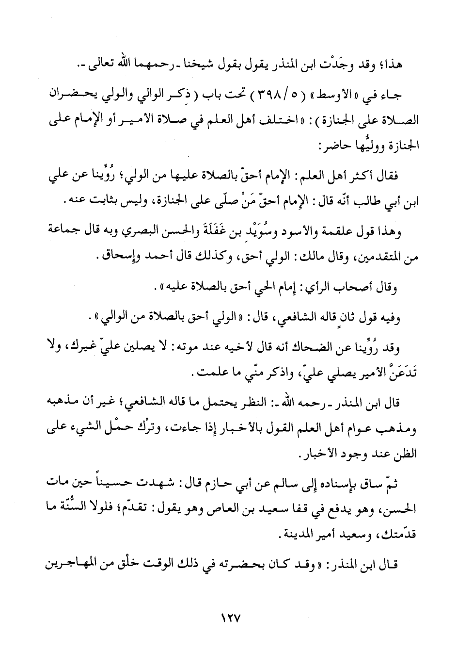 جاء في "الأوسط" (5/ 398) تحت باب (ذِكر الوالي والولي يحضران الصلاة على الجنازة): "اختلف أهل العلم في صلاة الأمير أو الإِمام على الجنازة ووليُّها حاضر: