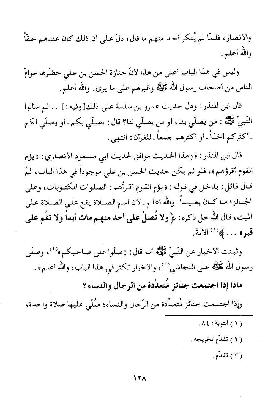 قال ابن المنذر: "وهذا الحديث موافق لحديث أبي مسعود الأنصاري: "يؤم القوم أقرؤهم"، فلو لم يكن حديث الحسن بن علي موجوداً في هذا الباب، ثمّ قال قائل: يدخل في قوله: "يؤم القوم أقرأُهم" الصلوات المكتوبات، وعلى الجنائز؛ ما كان بعيداً -والله أعلم- لأن اسم الصلاة يقع على الصلاة على الميت، قال الله جل ذكره: {ولا تُصلِّ على أحد منهم مات أبداً ولا تقُم على قبره ... } (¬1) الآية.