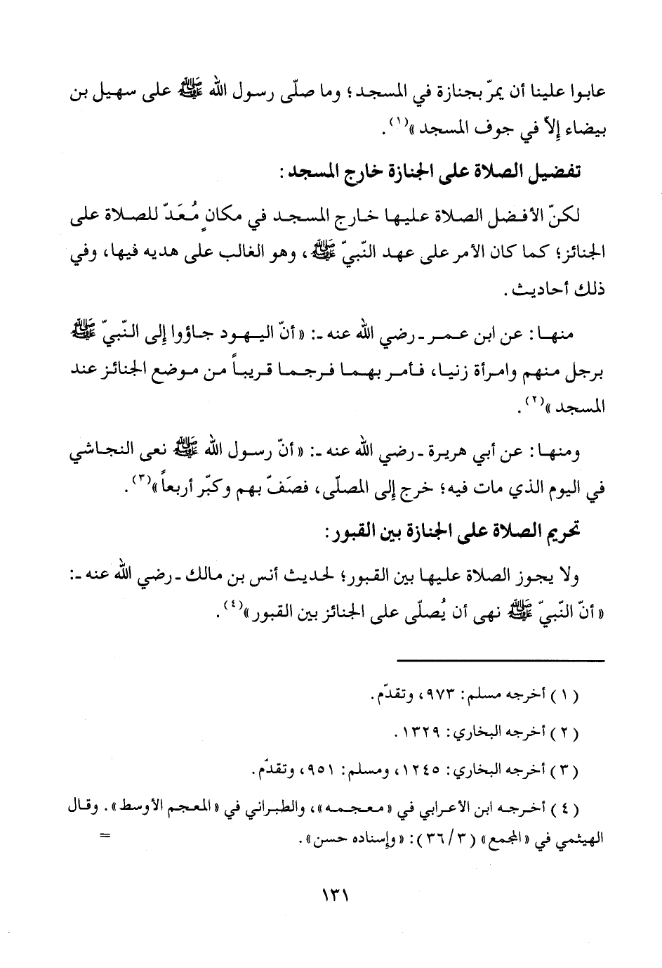 ولا يجوز الصلاة عليها بين القبور؛ لحديث أنس بن مالك -رضي الله عنه-: "أنّ النّبيّ - صَلَّى اللَّهُ عَلَيْهِ وَسَلَّمَ - نهى أن يصلّى على الجنائز بين القبور" (¬4).