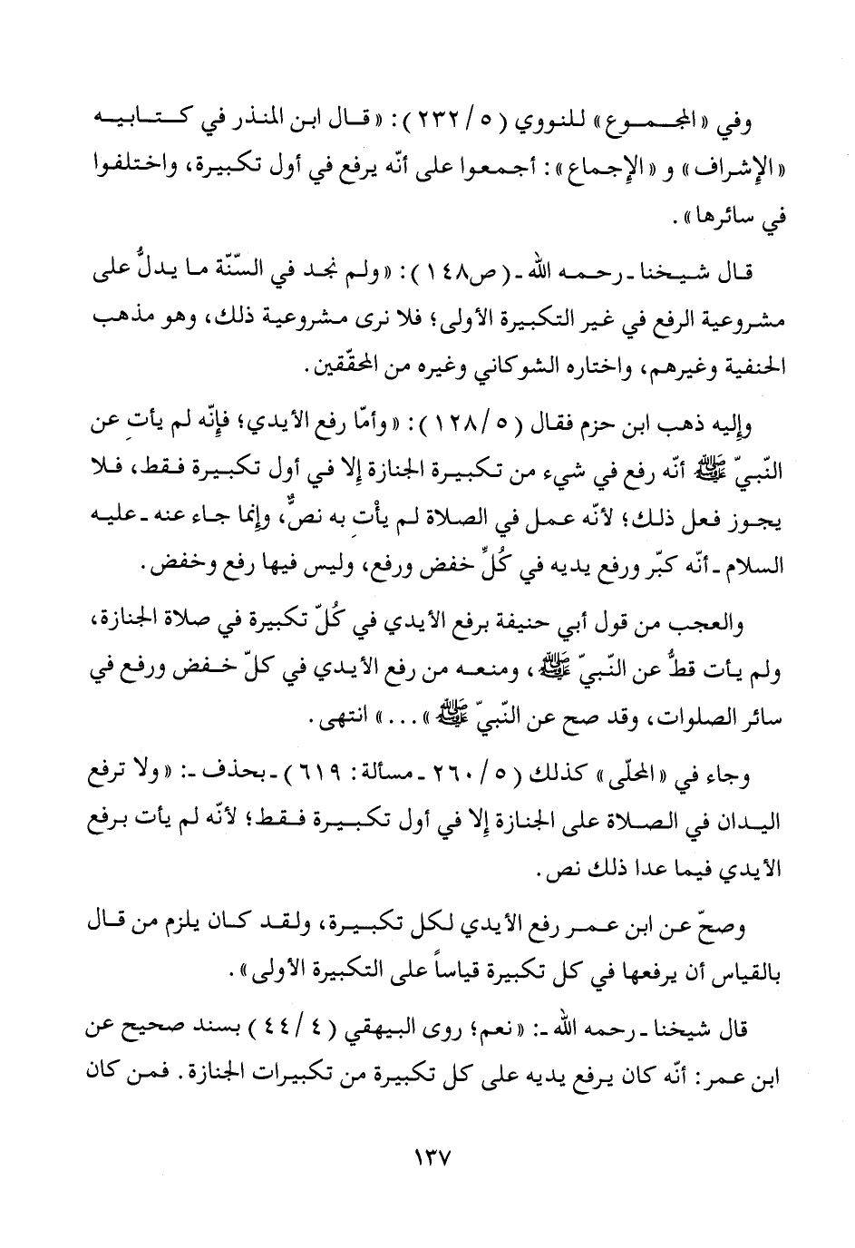 وجاء في "المحلّى" كذلك (5/ 260 - مسألة: 619) -بحذف-: "ولا ترفع اليدان في الصلاة على الجنازة إِلا في أول تكبيرة فقط؛ لأنّه لم يأت برفع الأيدي فيما عدا ذلك نص.