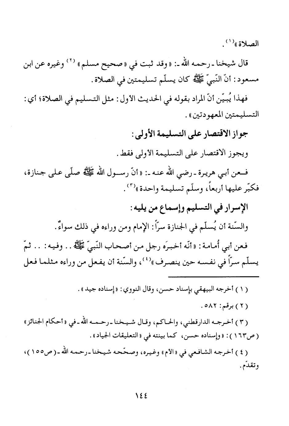 قال شيخنا -رحمه الله-: "وقد ثبت في "صحيح مسلم" (¬2) وغيره عن ابن مسعود: أنّ النّبيّ - صَلَّى اللَّهُ عَلَيْهِ وَسَلَّمَ - كان يسلّم تسليمتين في الصلاة.
