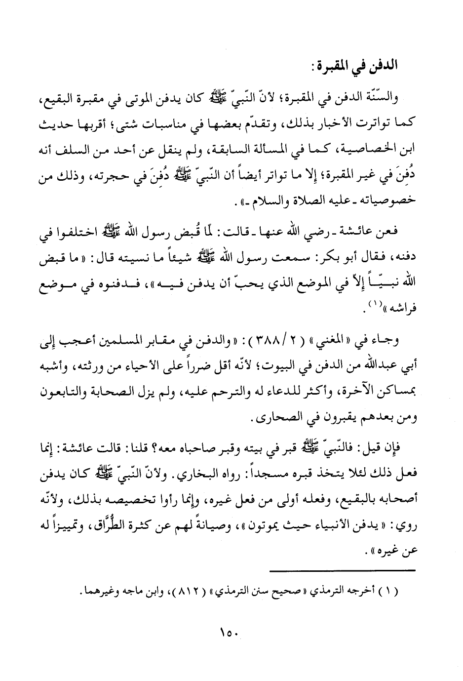 والسّنّة الدفن في المقبرة؛ لأنّ النّبيّ - صَلَّى اللَّهُ عَلَيْهِ وَسَلَّمَ - كان يدفن الموتى في مقبرة البقيع، كما تواترت الأخبار بذلك، وتقدّم بعضها في مناسبات شتى؛ أقربها حديث ابن الخصاصية، كما في المسألة السابقة، ولم ينقل عن أحد من السلف أنه دُفِنَ في غير المقبرة؛ إِلا ما تواتر أيضاً أن النّبيّ - صَلَّى اللَّهُ عَلَيْهِ وَسَلَّمَ - دُفِنَ في حجرته، وذلك من خصوصياته -عليه الصلاة والسلام-".
