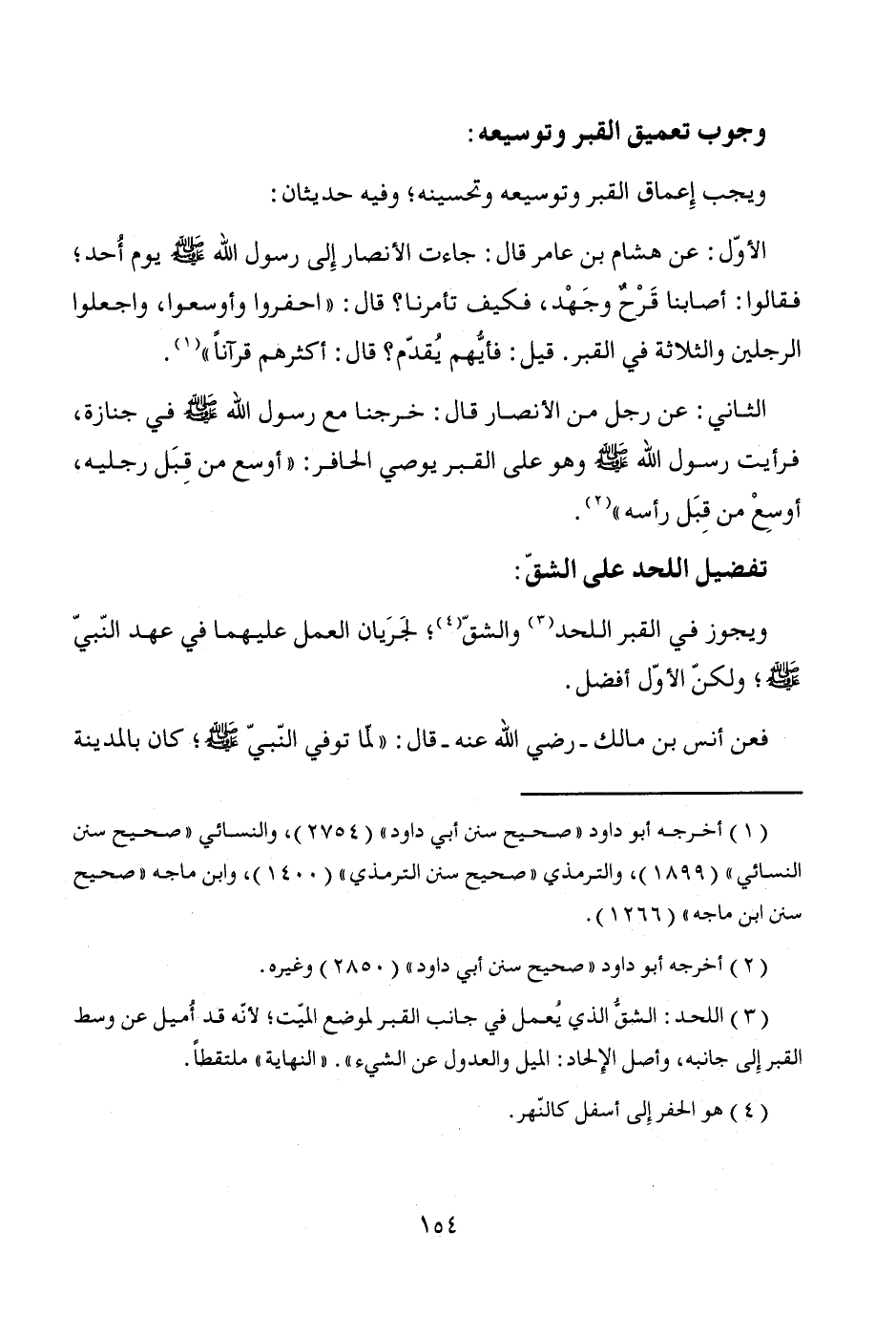 الثاني: عن رجل من الأنصار قال: خرجنا مع رسول الله - صَلَّى اللَّهُ عَلَيْهِ وَسَلَّمَ - في جنازة، فرأيت رسول الله - صَلَّى اللَّهُ عَلَيْهِ وَسَلَّمَ - وهو على القبر يوصي الحافر: "أوسع من قِبَل رجليه، أوسِعْ من قِبَل رأسه" (¬2).