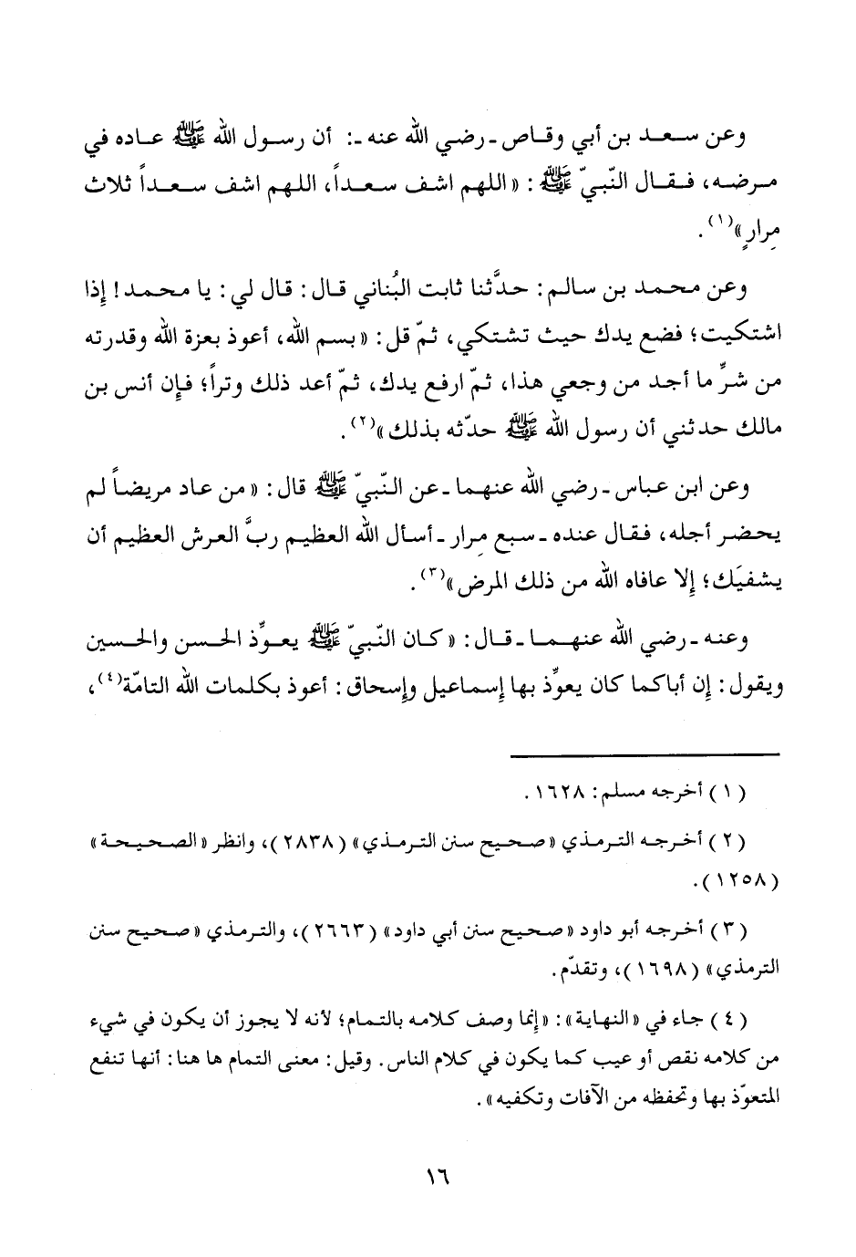 وعن سعد بن أبي وقاص -رضي الله عنه-: أن رسول الله - صَلَّى اللَّهُ عَلَيْهِ وَسَلَّمَ - عاده في مرضه، فقال النّبيّ - صَلَّى اللَّهُ عَلَيْهِ وَسَلَّمَ -: "اللهم اشف سعداً، اللهم اشف سعداً ثلاث مِرارٍ" (¬1).