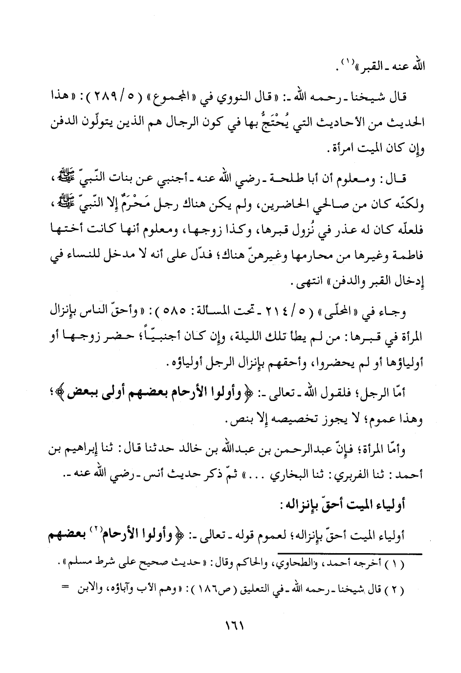 قال شيخنا -رحمه الله-: "قال النووي في "المجموع" (5/ 289): "هذا الحديث من الأحاديث التي يُحْتَجُّ بها في كون الرجال هم الذين يتولّون الدفن وإن كان الميت امرأة.