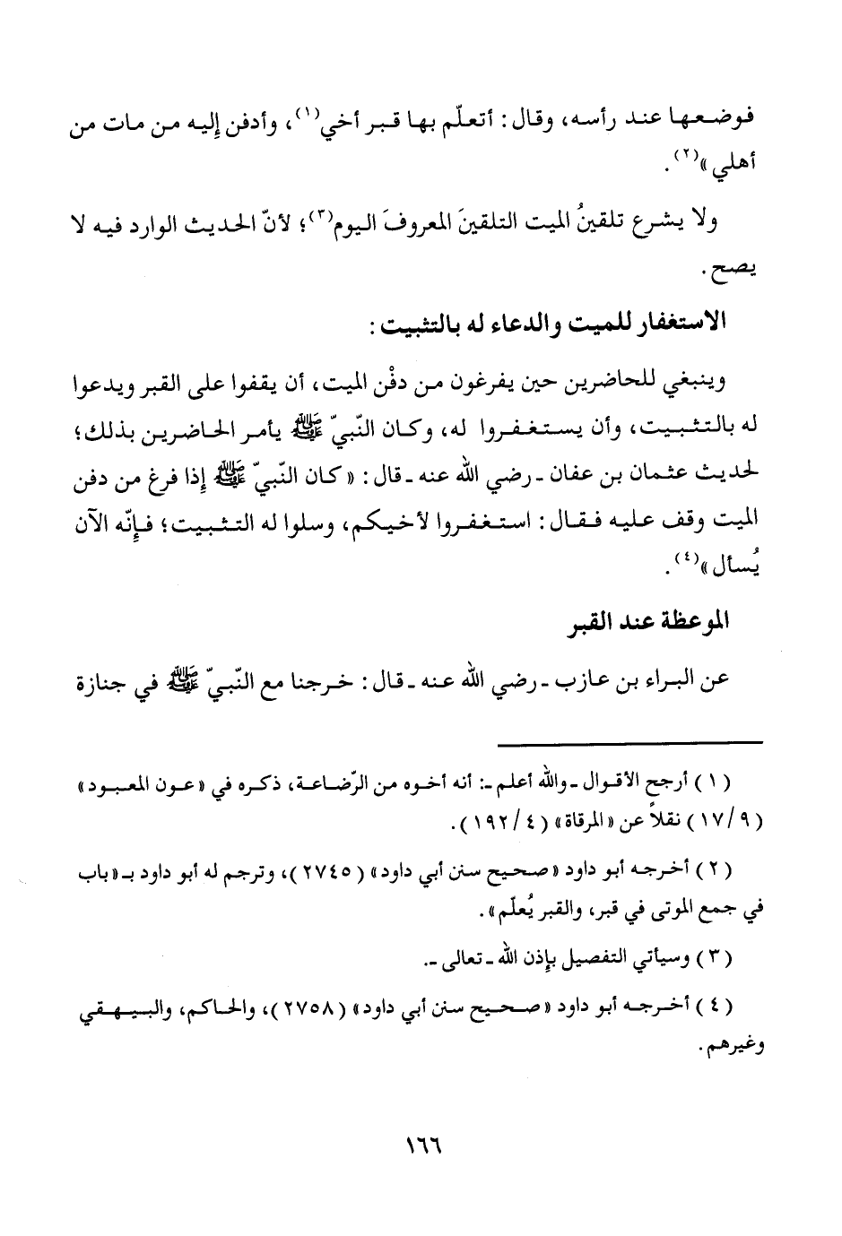 وينبغي للحاضرين حين يفرغون من دفْن الميت، أن يقفوا على القبر ويدعوا له بالتثبيت، وأن يستغفروا له، وكان النّبيّ - صَلَّى اللَّهُ عَلَيْهِ وَسَلَّمَ - يأمر الحاضرين بذلك؛ لحديث عثمان بن عفان -رضي الله عنه- قال: "كان النّبيّ - صَلَّى اللَّهُ عَلَيْهِ وَسَلَّمَ - إِذا فرغ من دفن الميت وقف عليه فقال: استغفروا لأخيكم، وسلوا له التثبيت؛ فإِنّه الآن يُسأل" (¬4).