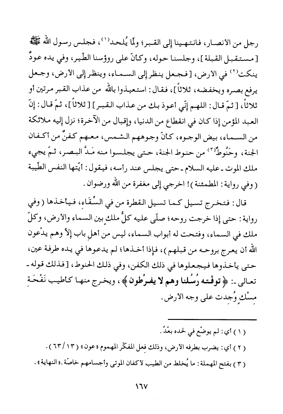 رجل من الأنصار، فانتهينا إِلى القبر؛ ولمّا يُلحد (¬1)، فجلس رسول الله - صَلَّى اللَّهُ عَلَيْهِ وَسَلَّمَ -[مستقبل القبلة]، وجلسنا حوله، وكأنّ على روؤسنا الطّير، وفي يده عودٌ ينكت (¬2) في الأرض، [فجعل ينظر إِلى السماء، وينظر إِلى الأرض، وجعل يرفع بصره ويخفضه، ثلاثاً]، فقال: استعيذوا بالله من عذاب القبر مرتين أو ثلاثاً، [ثمّ قال: اللهم إِنّي أعوذ بك من عذاب القبر] [ثلاثاً]، ثمّ قال: إِنّ العبد المؤمن إِذا كان في انقطاع من الدنيا، وإقبال من الآخرة؛ نزل إِليه ملائكة من السماء، بيض الوجوه، كأنّ وجوههم الشمس، معهم كفنٌ من أكفان الجنة، وحَنُوطٌ (¬3) من حنوط الجنة، حتى يجلسوا منه مَدَّ البصر، ثمّ يجيء ملك الموت -عليه السلام- حتى يجلس عند رأسه، فيقول: أيّتها النفس الطيبة (وفي رواية: المطمئنة)! اخرجي إِلى مغفرة من الله ورضوان.