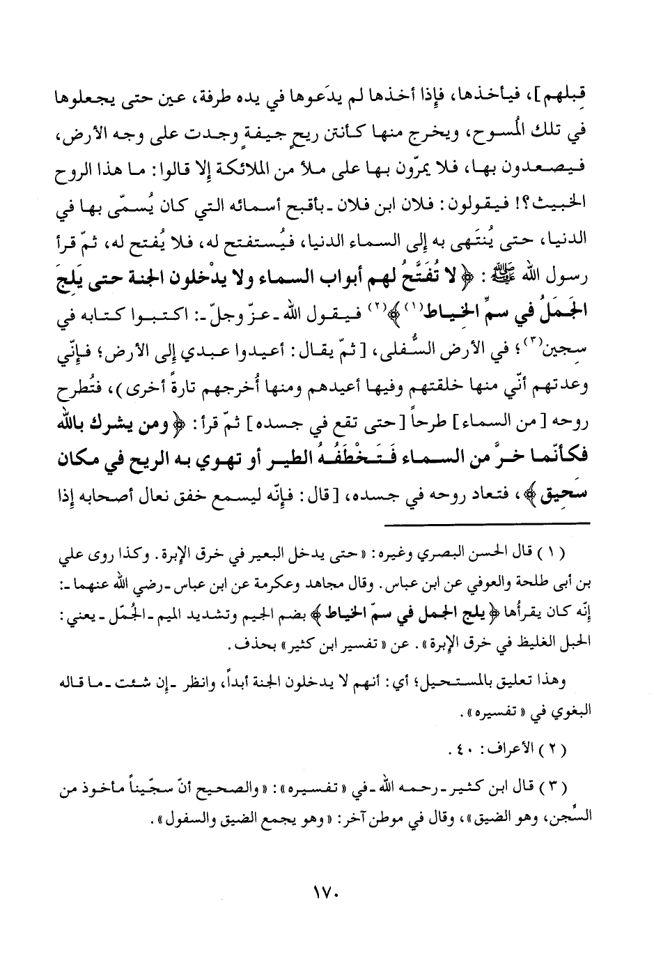 (¬1) قال الحسن البصري وغيره: "حتى يدخل البعير في خرق الإِبرة. وكذا روى علي بن أبى طلحة والعوفي عن ابن عباس. وقال مجاهد وعكرمة عن ابن عباس -رضي الله عنهما-: إِنّه كان يقرأُها {يلج الجمل في سمّ الخياط} بضم الجيم وتشديد الميم -الجُمّل- يعني: الحبل الغليظ في خرق الإِبرة". عن "تفسير ابن كثير" بحذف.