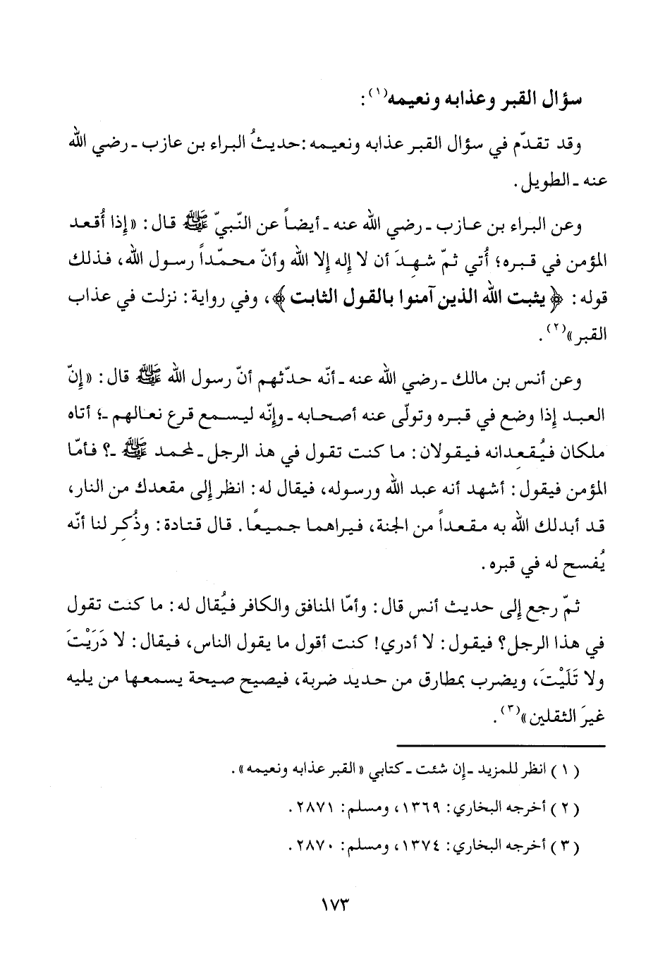 وقد تقدّم في سؤال القبر عذابه ونعيمه: حديثُ البراء بن عازب -رضي الله عنه- الطويل. وعن البراء بن عازب -رضي الله عنه- أيضاً عن النّبيّ - صَلَّى اللَّهُ عَلَيْهِ وَسَلَّمَ - قال: "إِذا أُقعد المؤمن في قبره؛ أُتي ثمّ شهِدَ أن لا إِله إِلا الله وأنّ محمّداً رسول الله، فذلك قوله: {يثبت الله الذين آمنوا بالقول الثابت}، وفي رواية: نزلت في عذاب القبر" (¬2).
