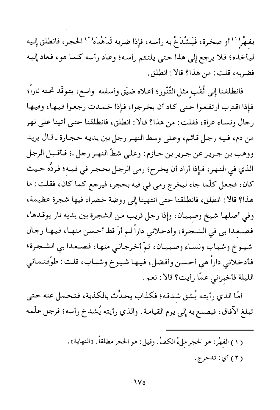 فانطلقنا إِلى ثُقْبٍ مثل التّنّور؛ أعلاه ضيّق وأسفله واسع، يتوقّد تحته ناراً؛ فإِذا اقترب ارتفعوا حتى كاد أن يخرجوا، فإِذا خمدت رجعوا فيها، وفيها رجال ونساء عراة، فقلت: من هذا؟ قالا: انطلق، فانطلقنا حتى أتينا على نهر من دم، فيه رجل قائم، وعلى وسط النهر رجل بين يديه حجارة -قال يزيد ووهب بن جرير عن جرير بن حازم: وعلى شطّ النهر رجل-؛ فأقبل الرجل الذي في النهر، فإِذا أراد أن يخرج؛ رمى الرجل بحجر في فيهِ؛ فردَّه حيث كان، فجعل كلّما جاء ليخرج رمى في فيه بحجر، فيرجع كما كان، فقلت: ما هذا؟ قالا: انطلق، فانطلقنا حتى انتهينا إِلى روضة خضراء فيها شجرة عظيمة، وفي أصلها شيخ وصِبيان، وإذا رجل قريب من الشجرة بين يديه نار يوقدها، فصعِدا بي في الشجرة، وأدخلاني داراً لم أرَ قط أحسن منها، فيها رجال شيوخ وشباب ونساء وصبيان، ثمّ أخرجاني منها، فصعدا بي الشجرة؛ فأدخلاني داراً هي أحسن وأفضل، فيها شيوخ وشباب، قلت: طوّفتماني الليلة فأخبِراني عمّا رأيت؟ قالا: نعم.