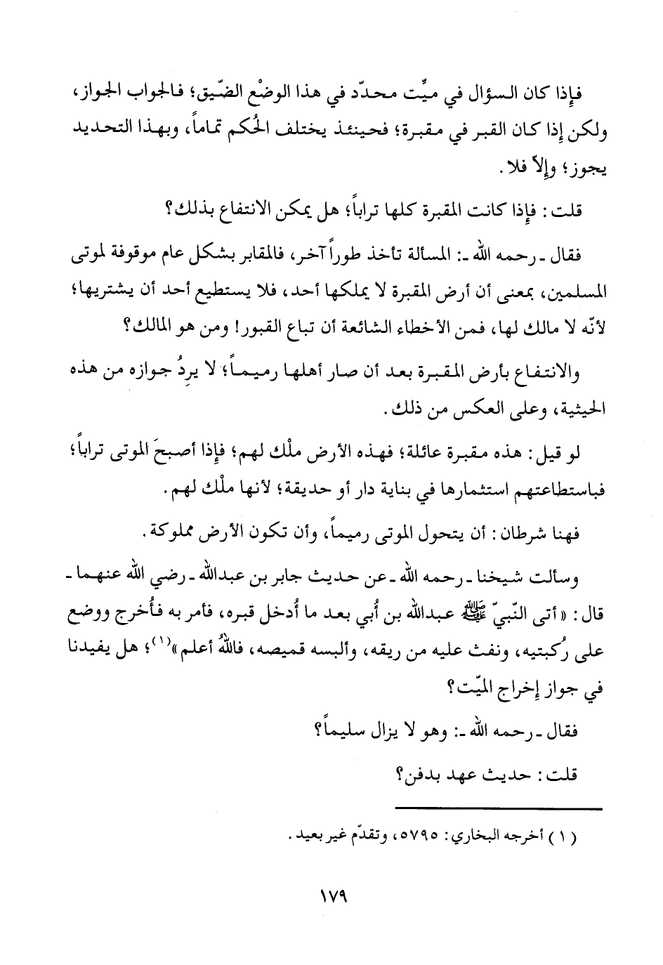 فقال -رحمه الله-: المسألة تأخذ طوراً آخر، فالمقابر بشكل عام موقوفة لموتى المسلمين، بمعنى أن أرض المقبرة لا يملكها أحد، فلا يستطيع أحد أن يشتريها؛ لأنّه لا مالك لها، فمن الأخطاء الشائعة أن تباع القبور! ومن هو المالك؟