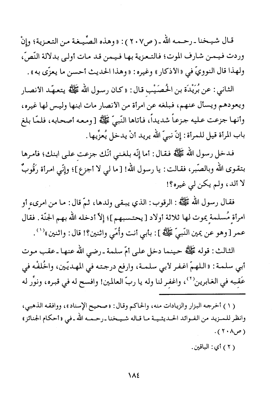 قال شيخنا -رحمه الله- (ص 207): "وهذه الصِّيغة من التعزية؛ وإنْ وردت فيمن شارف الموت؛ فالتعزية بها فيمن قد مات أولى بدلالة النّصّ، ولهذا قال النوويّ في "الأذكار" وغيره: "وهذا الحديث أحسن ما يعزّى به".
