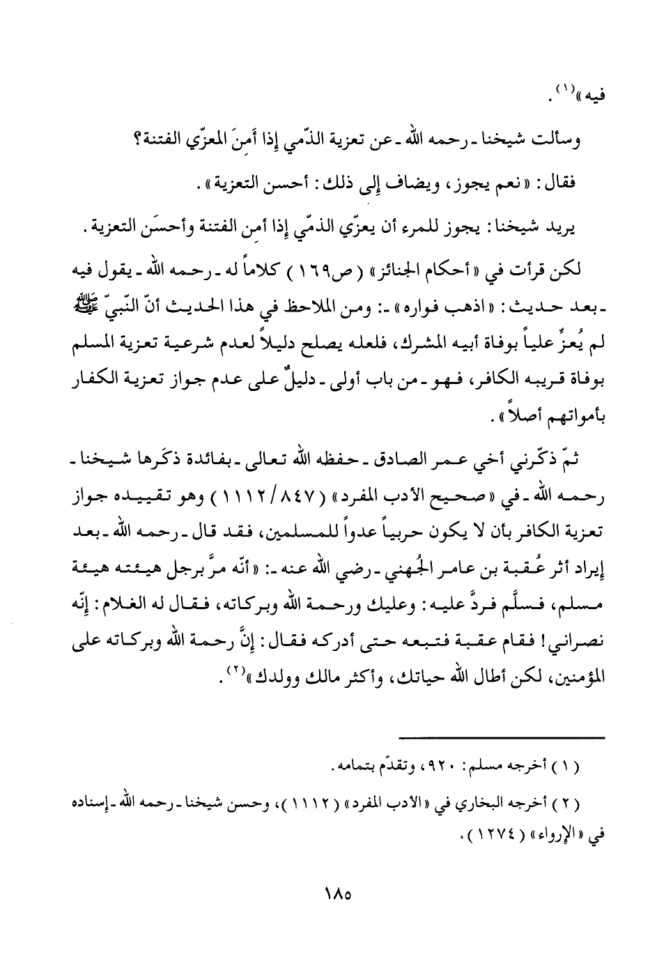 ثمّ ذكّرني أخي عمر الصادق -حفظه الله تعالى- بفائدة ذكَرها شيخنا - رحمه الله- في "صحيح الأدب المفرد" (847/ 1112) وهو تقييده جواز تعزية الكافر بأن لا يكون حربياً عدواً للمسلمين، فقد قال -رحمه الله- بعد إِيراد أثر عُقبة بن عامر الجُهني -رضي الله عنه-: "أنّه مرَّ برجل هيئته هيئة مسلم، فسلَّم فردَّ عليه: وعليك ورحمة الله وبركاته، فقال له الغلام: إِنّه نصراني! فقام عقبة فتبعه حتى أدركه فقال: إِنَّ رحمة الله وبركاته على المؤمنين، لكن أطال الله حياتك، وأكثر مالك وولدك" (¬2).