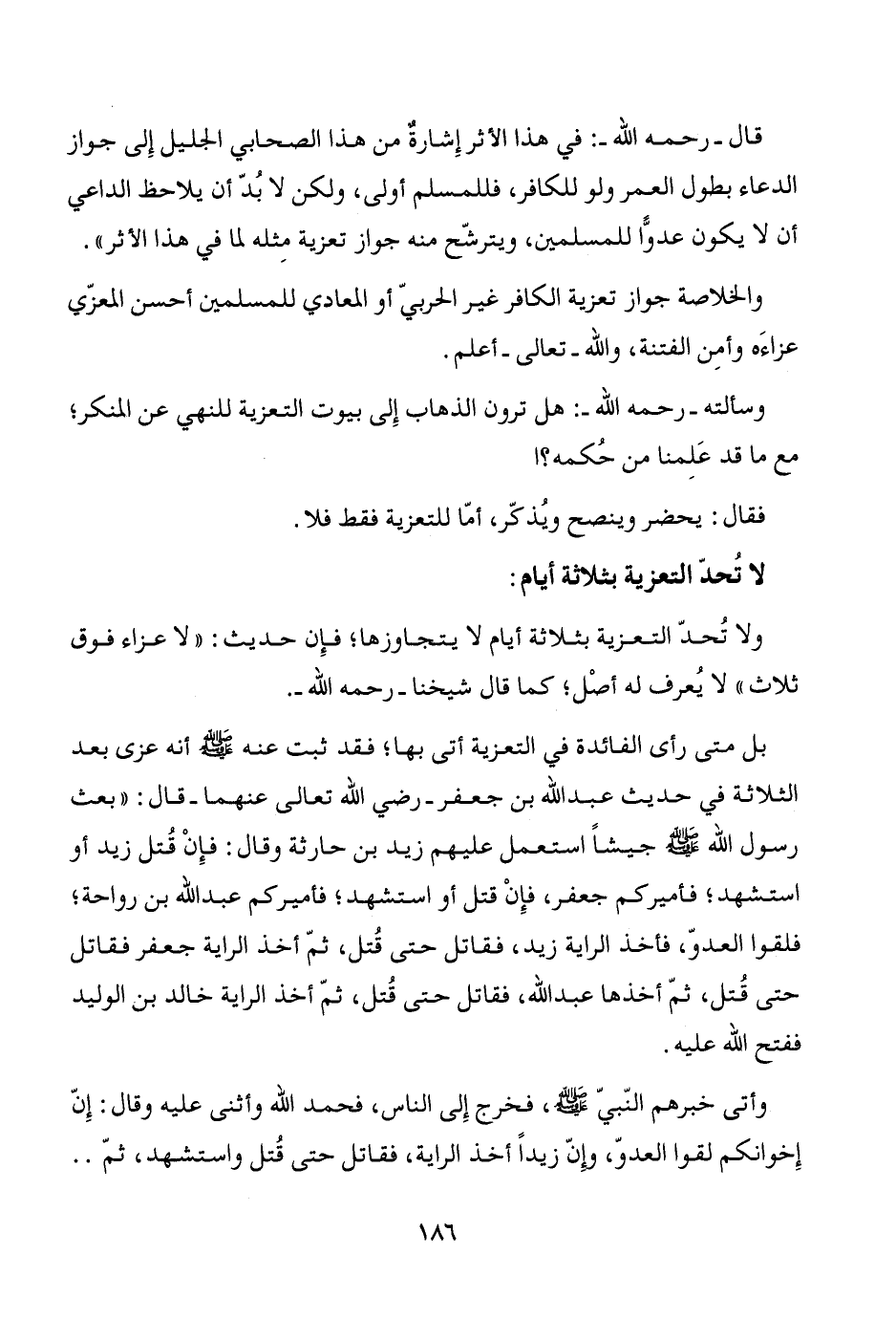 بل متى رأى الفائدة في التعزية أتى بها؛ فقد ثبت عنه - صَلَّى اللَّهُ عَلَيْهِ وَسَلَّمَ - أنه عزى بعد الثلاثة في حديث عبد الله بن جعفر -رضي الله تعالى عنهما- قال: "بعث رسول الله - صَلَّى اللَّهُ عَلَيْهِ وَسَلَّمَ - جيشاً استعمل عليهم زيد بن حارثة وقال: فإِنْ قُتل زيد أو استشهد؛ فأميركم جعفر، فإِنْ قتل أو استشهد، فأميركم عبد الله بن رواحة؛ فلقوا العدوّ، فأخذ الراية زيد، فقاتل حتى قُتل، ثمّ أخذ الراية جعفر فقاتل حتى قُتل، ثمّ أخذها عبد الله، فقاتل حتى قُتل، ثمّ أخذ الراية خالد بن الوليد ففتح الله عليه.