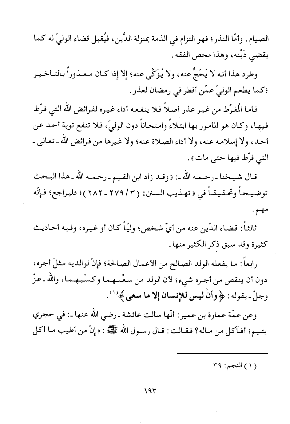 فأما المُفرّط من غير عذر أصلاً فلا ينفعه أداء غيره لفرائض الله التي فرّط فيها، وكان هو المأمور بها ابتلاءً وامتحاناً دون الوليّ، فلا تنفع توبة أحد عن أحد، ولا إِسلامه عنه، ولا أداء الصلاة عنه؛ ولا غيرها من فرائض الله -تعالى- التي فرّط فيها حتى مات".