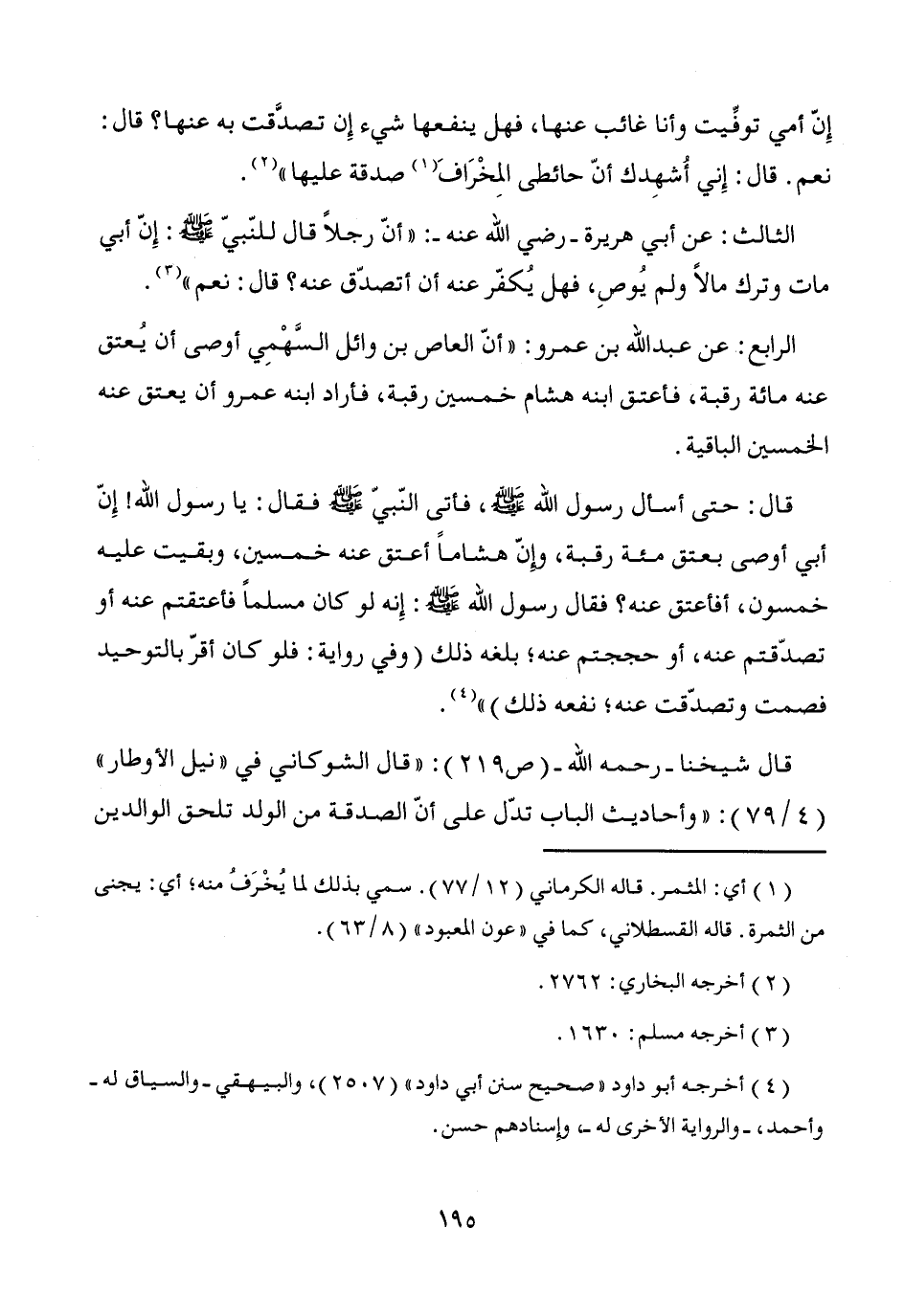 الرابع: عن عبد الله بن عمرو: "أنّ العاص بن وائل السَّهْمِي أوصى أن يُعتق عنه مائة رقبة، فأعتق ابنه هشام خمسين رقبة، فأراد ابنه عمرو أن يعتق عنه الخمسين الباقية.