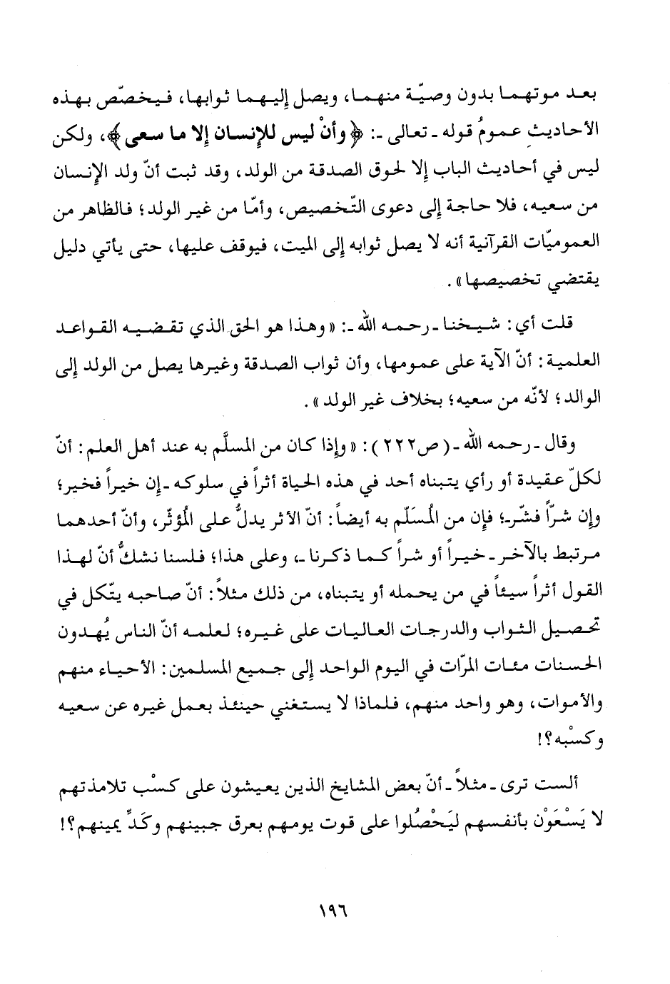 وقال -رحمه الله- (ص 222): "وإذا كان من المسلَّم به عند أهل العلم: أنّ لكلّ عقيدة أو رأي يتبناه أحد في هذه الحياة أثراً في سلوكه -إِن خيراً فخير؛ وإن شرّاً فشّر-؛ فإِن من المُسَلّم به أيضاً: أنّ الأثر يدلُّ على المُؤثّر، وأنّ أحدهما مرتبط بالآخر -خيراً أو شراً كما ذكرنا-، وعلى هذا؛ فلسنا نشكُّ أنّ لهذا القول أثراً سيئاً في من يحمله أو يتبناه، من ذلك مثلاً: أنّ صاحبه يتّكل في تحصيل الثواب والدرجات العاليات على غيره؛ لعلمه أنّ الناس يُهدون الحسنات مئات المرّات في اليوم الواحد إِلى جميع المسلمين: الأحياء منهم والأموات، وهو واحد منهم، فلماذا لا يستغني حينئذ بعمل غيره عن سعيه وكسْبه؟!