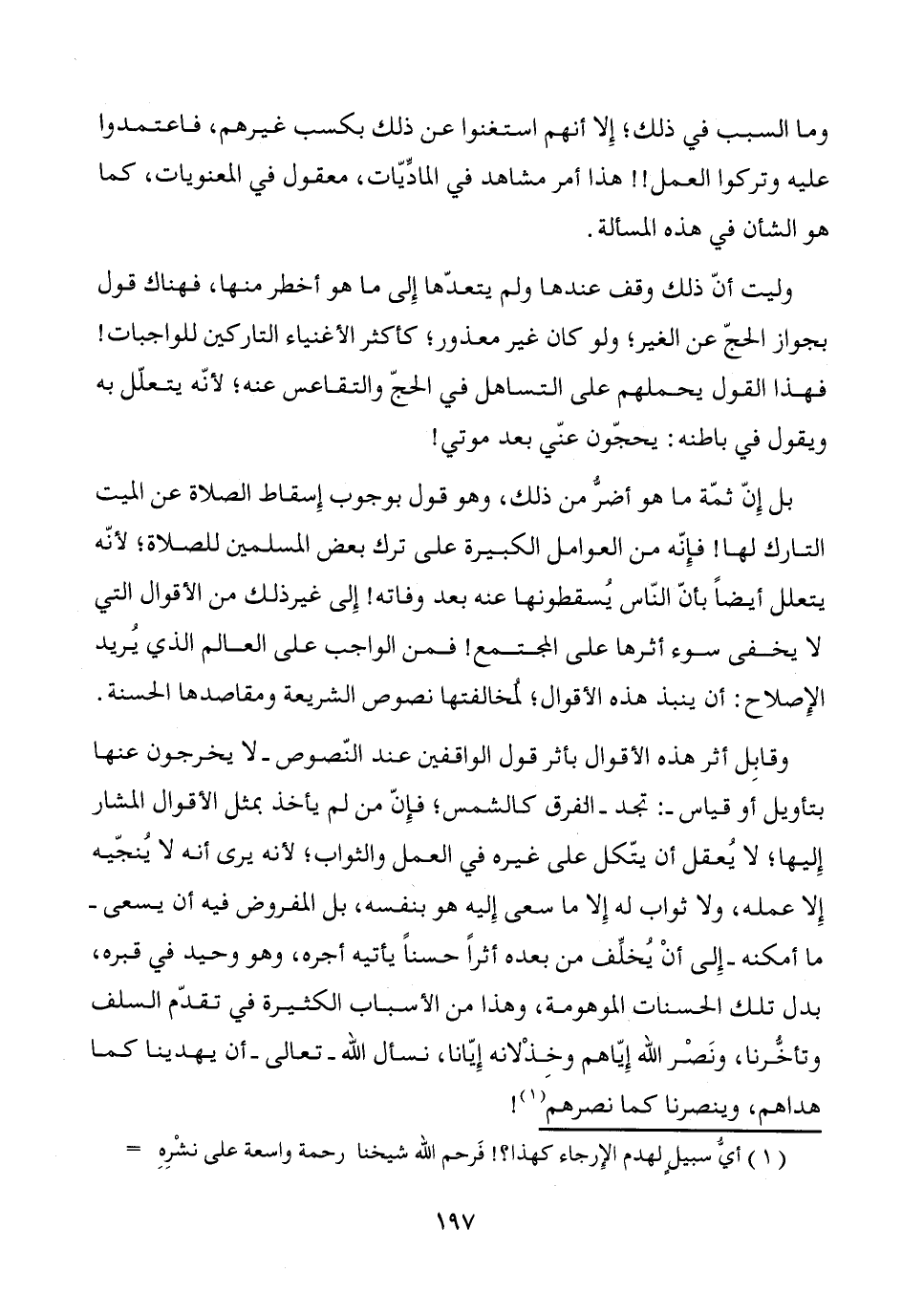 وقابِل أثر هذه الأقوال بأثر قول الواقفين عند النّصوص -لا يخرجون عنها بتأويل أو قياس-: تجد - الفرق كالشمس؛ فإِنّ من لم يأخذ بمثل الأقوال المشار إِليها؛ لا يُعقل أن يتّكل على غيره في العمل والثواب؛ لأنه يرى أنه لا يُنجّيه إِلا عمله، ولا ثواب له إِلا ما سعى إِليه هو بنفسه، بل المفروض فيه أن يسعى - ما أمكنه- إِلى أنْ يُخلِّف من بعده أثراً حسناً يأتيه أجره، وهو وحيد في قبره، بدل تلك الحسنات الموهومة، وهذا من الأسباب الكثيرة في تقدّم السلف وتأخُّرنا، ونَصْر الله إِيّاهم وخِذْلانه إِيّانا، نسأل الله -تعالى- أن يهدينا كما هداهم، وينصرنا كما نصرهم (¬1)!