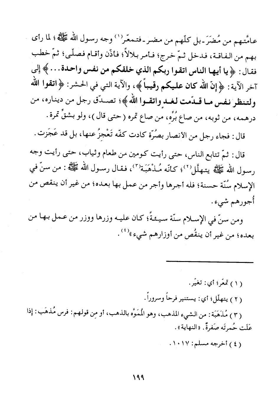 عامَّتهم من مُضَرَ -بل كلّهم من مضر- فتمعّر (¬1) وجه رسول الله - صَلَّى اللَّهُ عَلَيْهِ وَسَلَّمَ -، لما رأى بهم من الفاقة، فدخل ثمّ خرج؛ فأمر بلالاً؛ فأذّن وأقام فصلّى؛ ثمّ خطب فقال: {يا أيها الناس اتقوا ربكم الذي خلقكم من نفس واحدة ... } إِلى آخر الآية: {إِنّ الله كان عليكم رقيباً}، والآية التي في الحشر: {اتقوا الله ولتنظر نفس ما قدّمت لغدٍ واتقوا الله}؛ تصدّق رجل من ديناره، من درهمه، من ثوبه، من صاع بُرِّهِ، من صاع تمره (حتى قال)، ولو بشقِّ تمرة.