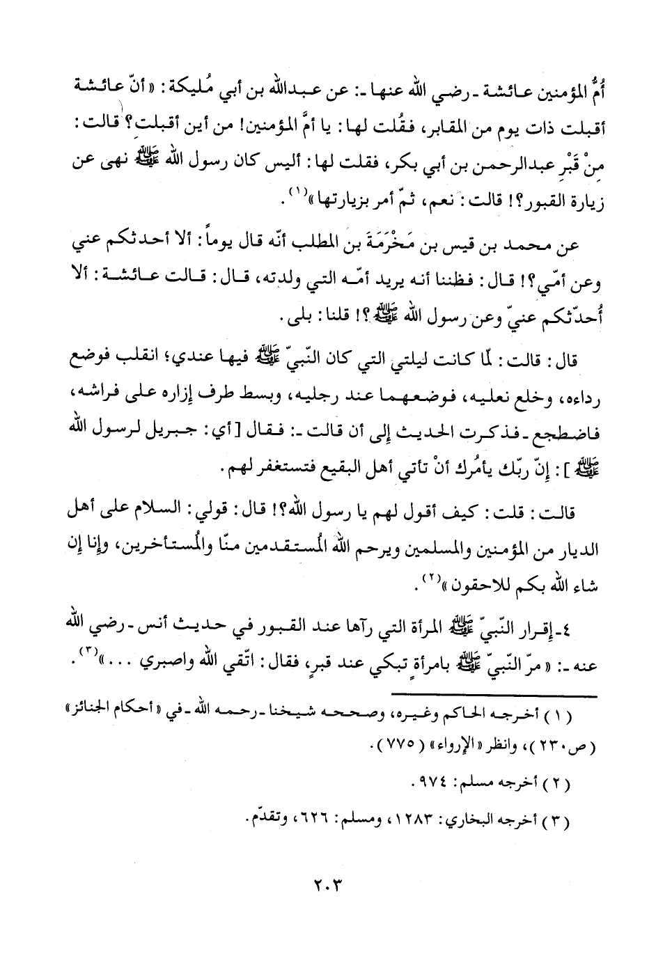 أُمُّ المؤمنين عائشة -رضي الله عنها-: عن عبد الله بن أبي مُليكة: "أنّ عائشة أقبلت ذات يوم من المقابر، فقُلت لها: يا أمَّ المؤمنين! من أين أقبلتِ؟ قالت: مِنْ قَبْرِ عبد الرحمن بن أبي بكر، فقلت لها: أليس كان رسول الله - صَلَّى اللَّهُ عَلَيْهِ وَسَلَّمَ - نهى عن زيارة القبور؟! قالت: نعم، ثمّ أمر بزيارتها" (¬1).