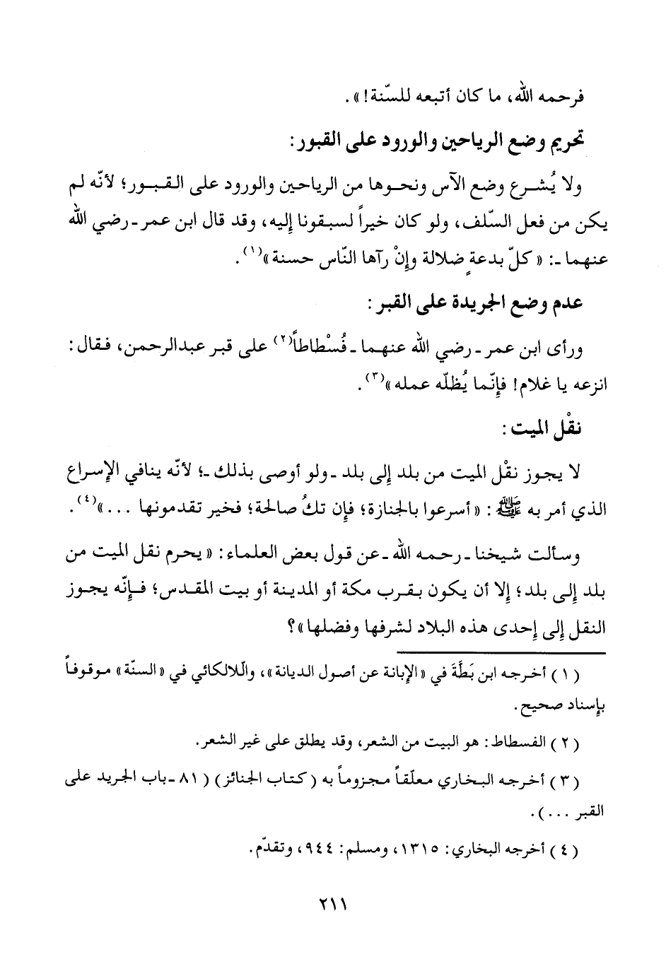 وسألت شيخنا -رحمه الله- عن قول بعض العلماء: "يحرم نقل الميت من بلد إِلى بلد؛ إِلا أن يكون بقرب مكة أو المدينة أو بيت المقدس، فإِنّه يجوز النقل إِلى إِحدى هذه البلاد لشرفها وفضلها"؟