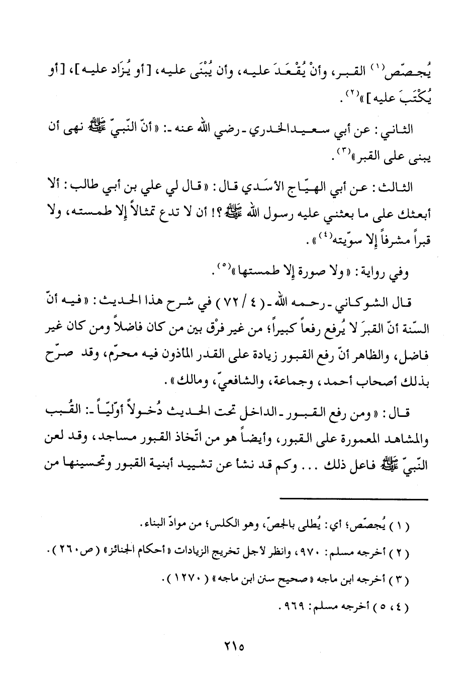 الثالث: عن أبي الهيّاج الأسَدي قال: "قال لي علي بن أبي طالب: ألا أبعثك على ما بعثني عليه رسول الله - صَلَّى اللَّهُ عَلَيْهِ وَسَلَّمَ -؟! أن لا تدع تمثالاً إِلا طمسته، ولا قبراً مشرفاً إِلا سوّيته (¬4) ".