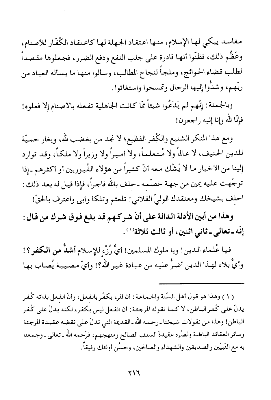 فيا عُلماء الدين! ويا ملوك المسلمين! أيُّ رُزْءٍ للإِسلام أشدُّ من الكفر؟! وأيُّ بلاء لهذا الدين أضرُّ عليه من عبادة غير الله؟! وأيّ مصيبة يُصاب بها