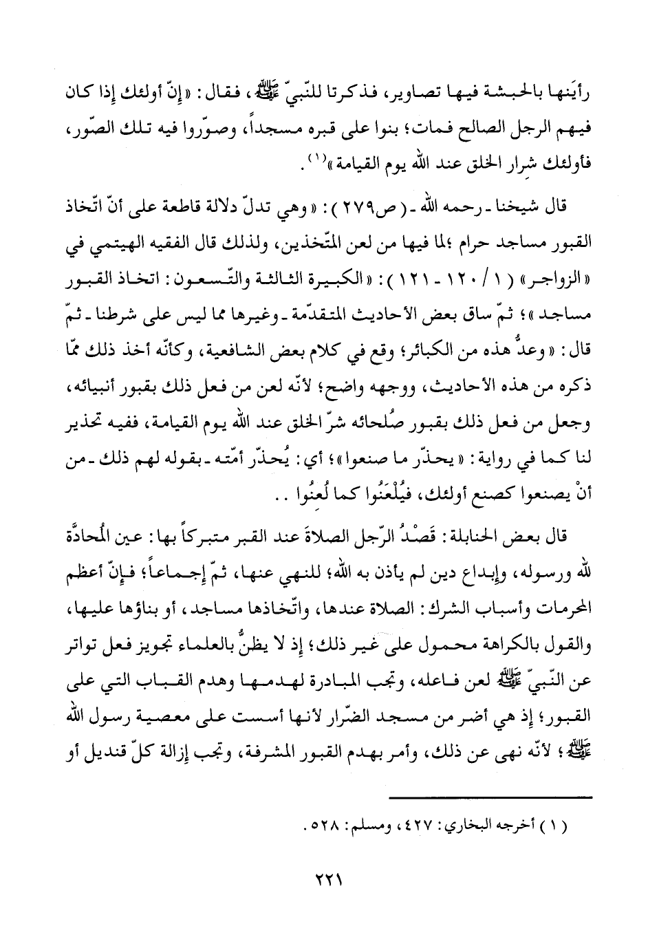 قال شيخنا -رحمه الله- (ص 279): "وهي تدلّ دلالة قاطعة على أنّ اتّخاذ القبور مساجد حرام؛ لما فيها من لعن المتّخذين، ولذلك قال الفقيه الهيتمي في "الزواجر" (1/ 120 - 121): "الكبيرة الثالثة والتّسعون: اتخاذ القبور مساجد"؛ ثمّ ساق بعض الأحاديث المتقدّمة -وغيرها مما ليس على شرطنا- ثمّ قال: "وعدُّ هذه من الكبائر؛ وقع في كلام بعض الشافعية، وكأنّه أخذ ذلك ممّا ذكره من هذه الأحاديث، ووجهه واضح؛ لأنّه لعن من فعل ذلك بقبور أنبيائه، وجعل من فعل ذلك بقبور صُلحائه شرّ الخلق عند الله يوم القيامة، ففيه تحذير لنا كما في رواية: "يحذّر ما صنعوا"، أي: يُحذّر أمّته -بقوله لهم ذلك- من أنْ يصنعوا كصنع أولئك، فيُلعَنُوا كما لُعِنُوا ..