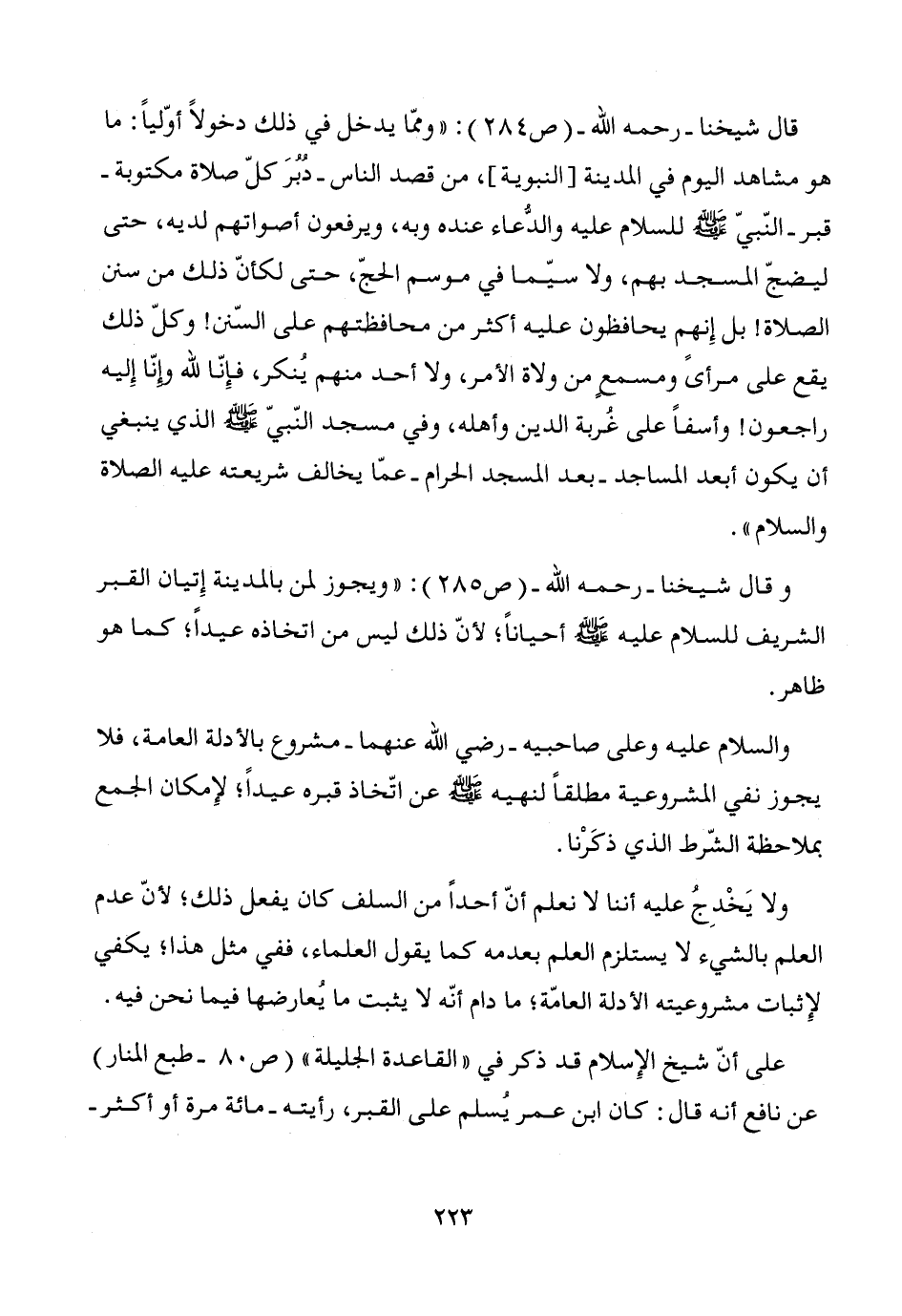 قال شيخنا -رحمه الله- (ص 284): "وممّا يدخل في ذلك دخولاً أوّلياً: ما هو مشاهد اليوم في الدينة [النبوية]، من قصد الناس -دُبُرَ كلّ صلاة مكتوبة- قبر- النّبيّ - صَلَّى اللَّهُ عَلَيْهِ وَسَلَّمَ - للسلام عليه والدُّعاء عنده وبه، ويرفعون أصواتهم لديه، حتى ليضجّ المسجد بهم، ولا سيّما في موسم الحجّ، حتى لكأنّ ذلك من سنن الصلاة! بل إِنهم يحافظون عليه أكثر من محافظتهم على السّنن! وكلّ ذلك يقع على مرأىً ومسمعٍ من ولاة الأمر، ولا أحد منهم يُنكر، فإِنّا لله وإنّا إِليه راجعون! وأسفاً على غُربة الدين وأهله، وفي مسجد النّبيّ - صَلَّى اللَّهُ عَلَيْهِ وَسَلَّمَ - الذي ينبغي أن يكون أبعد المساجد -بعد المسجد الحرام- عمّا يخالف شريعته عليه الصلاة والسلام".