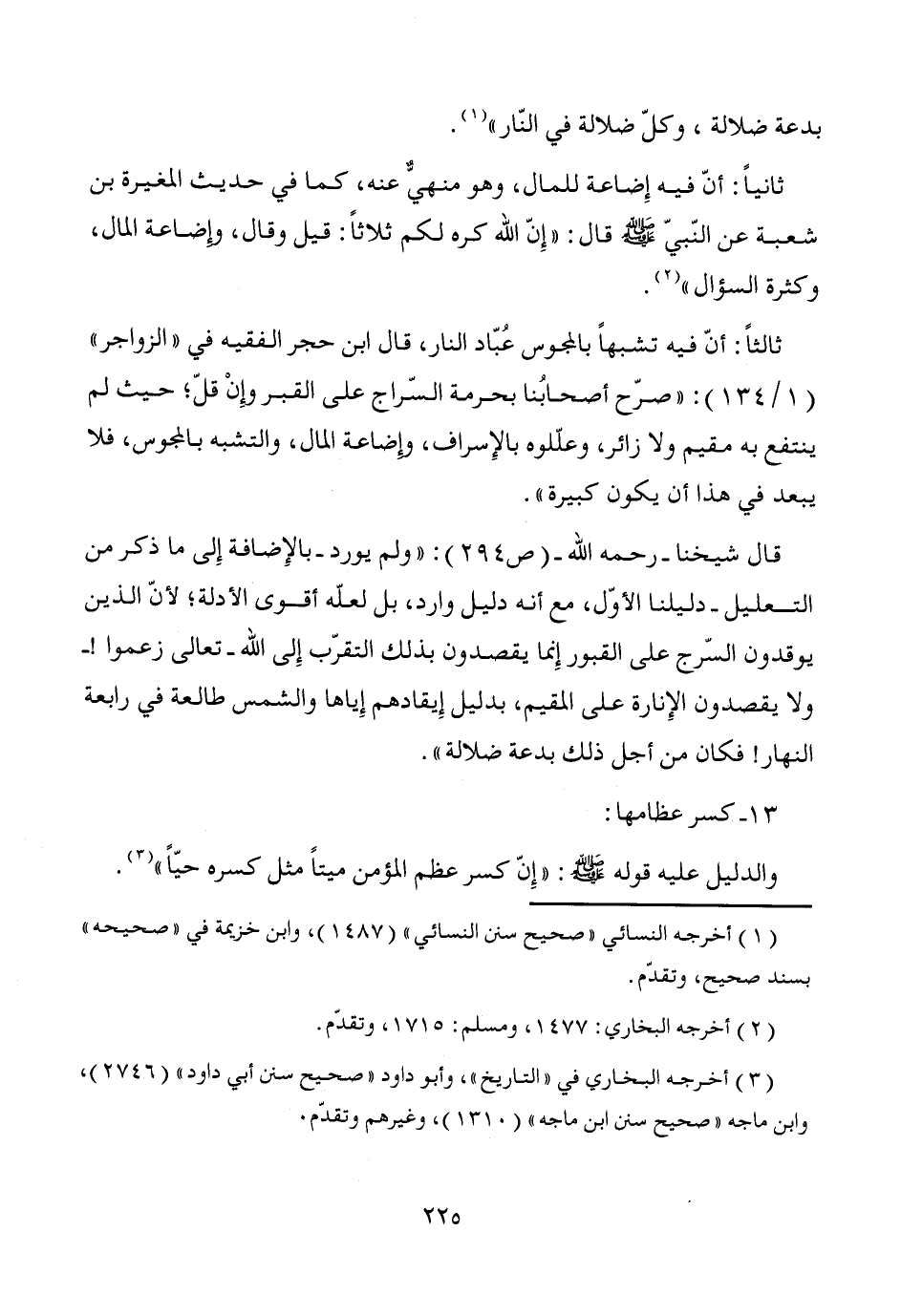 قال شيخنا -رحمه الله- (ص 294): "ولم يورد -بالإِضافة إِلى ما ذكر من التعليل- دليلنا الأوّل، مع أنه دليل وارد، بل لعلّه أقوى الأدلة؛ لأنّ الذين يوقدون السّرج على القبور إِنما يقصدون بذلك التقرّب إِلى الله -تعالى زعموا! - ولا يقصدون الإِنارة على المقيم، بدليل إِيقادهم إِياها والشمس طالعة في رابعة النهار! فكان من أجل ذلك بدعة ضلالة".