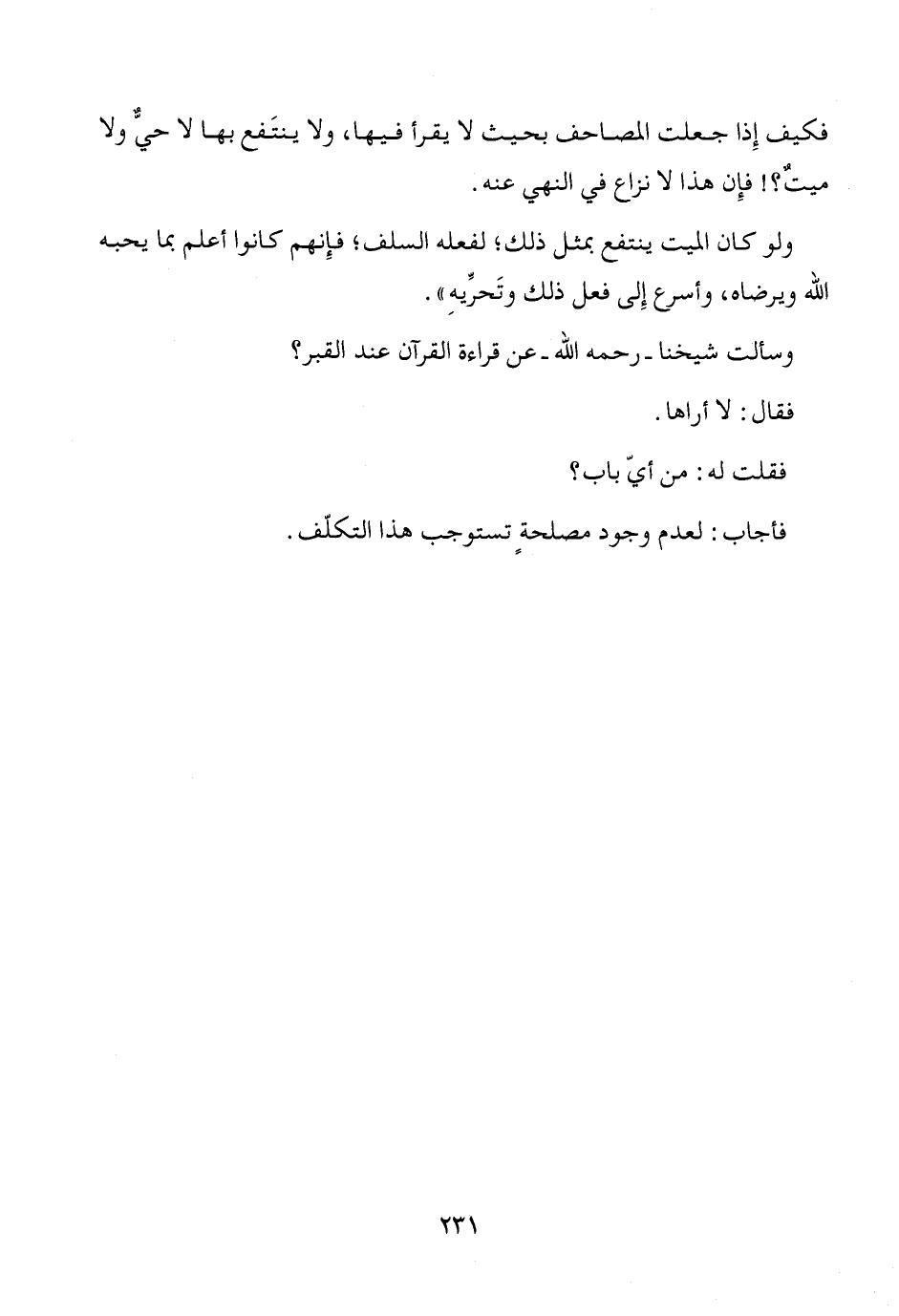 فكيف إِذا جعلت المصاحف بحيث لا يقرأ فيها، ولا ينتَفع بها لا حيٌّ ولا ميتٌ؟! فإِن هذا لا نزاع في النهي عنه.