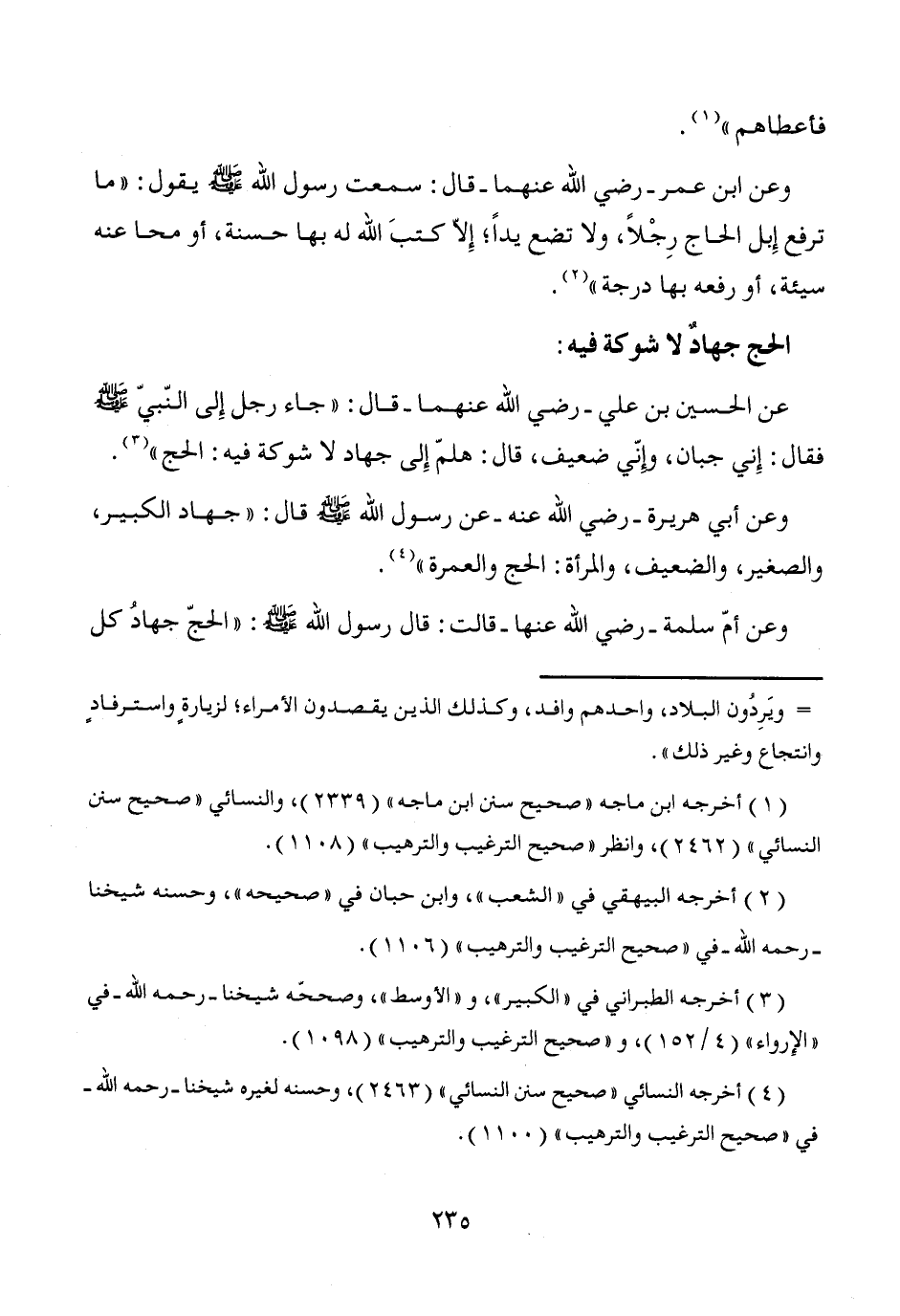 وعن أبي هريرة -رضي الله عنه- عن رسول الله - صَلَّى اللَّهُ عَلَيْهِ وَسَلَّمَ - قال: "جهاد الكبير، والصغير، والضعيف، والمرأة: الحج والعمرة" (¬4).