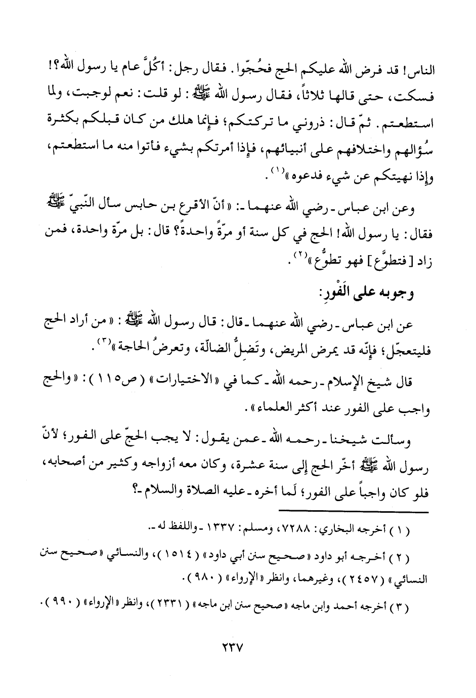 وعن ابن عباس -رضي الله عنهما-: "أنّ الأقرع بن حابس سأل النّبيّ - صَلَّى اللَّهُ عَلَيْهِ وَسَلَّمَ - فقال: يا رسول الله! الحج في كل سنة أو مرّةً واحدةً؟ قال: بل مرّة واحدة، فمن زاد [فتطوَّع] فهو تطوُّع" (¬2).