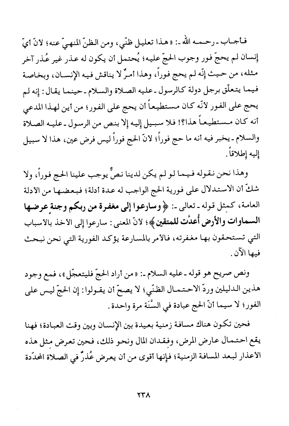 وهذا نحن نقوله فيما لو لم يكن لدينا نصٌّ يوجب علينا الحج فوراً، ولا شكّ أن الاستدلال على فورية الحج الواجب له عدة أدلة؛ فبعضها من الأدلة العامة، كمِثل قوله -تعالى-: {وسارعوا إِلى مغفرة من ربكم وجنة عرضها السماوات والأرض أُعدَّت للمتقين}؛ لأنّ المعنى: سارعوا إِلى الأخذ بالأسباب التي تستحقون بها مغفرته، فالأمر بالمسارعة يؤكد الفورية التي نحن نبحث فيها الآن.
