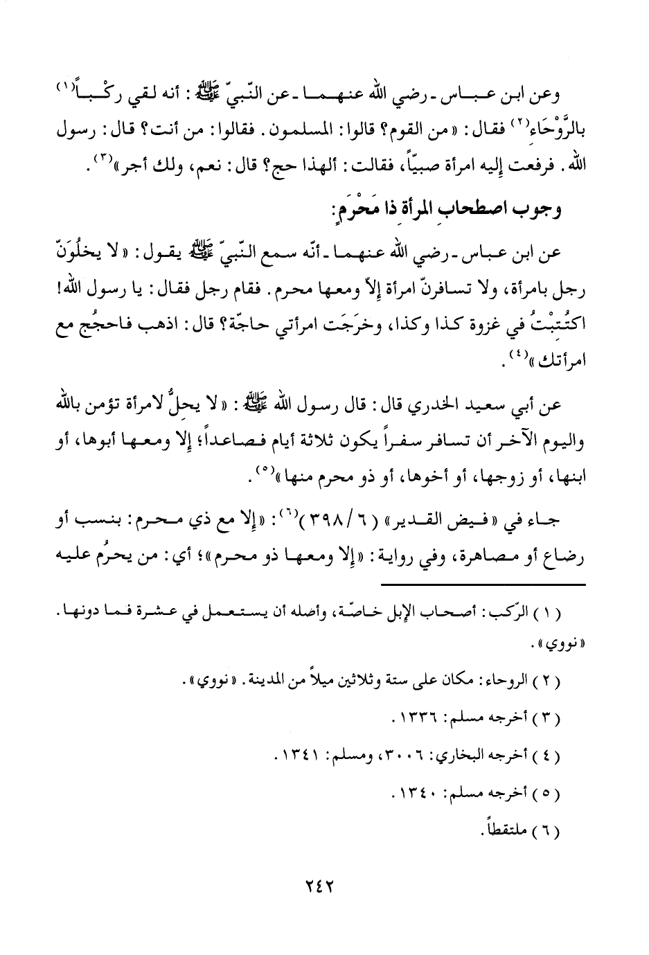 عن ابن عباس -رضي الله عنهما- أنّه سمع النّبيّ - صَلَّى اللَّهُ عَلَيْهِ وَسَلَّمَ - يقول: "لا يخلُوَنّ رجل بامرأة، ولا تسافرنّ امرأة إلاَّ ومعها محرم. فقام رجل فقال: يا رسول الله! اكتُتِبْتُ في غزوة كذا وكذا، وخرَجَت امرأتي حاجّة؟ قال: اذهب فاحجُج مع امرأتك" (¬4).