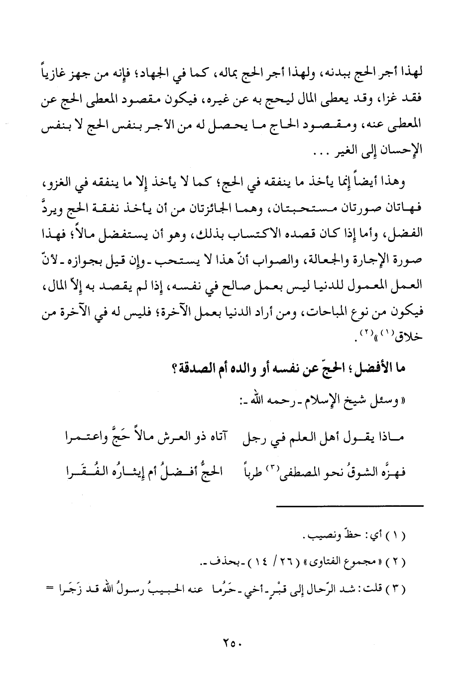 وهذا أيضاً إِنما يأخذ ما ينفقه في الحج؛ كما لا يأخذ إلا ما ينفقه في الغزو، فهاتان صورتان مستحبتان، وهما الجائزتان من أن يأخذ نفقة الحج ويردَّ الفضل، وأما إِذا كان قصده الاكتساب بذلك، وهو أن يستفضل مالاً؛ فهذا صورة الإِجارة والجعالة، والصواب أنّ هذا لا يستحب -وإِن قيل بجوازه- لأنّ العمل المعمول للدنيا ليس بعمل صالح في نفسه، إِذا لم يقصد به إلاَّ المال، فيكون من نوع المباحات، ومن أراد الدنيا بعمل الآخرة؛ فليس له في الآخرة من خلاق (¬1) " (¬2).