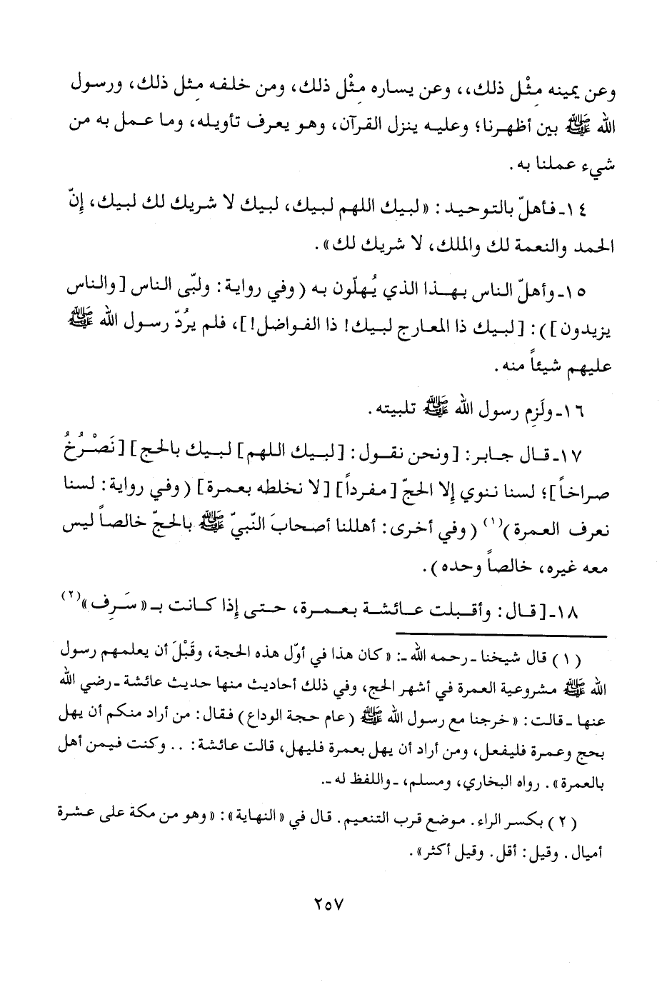 14 - فأهلّ بالتوحيد: "لبيك اللهم لبيك، لبيك لا شريك لك لبيك، إِنّ الحمد والنعمة لك والملك، لا شريك لك".