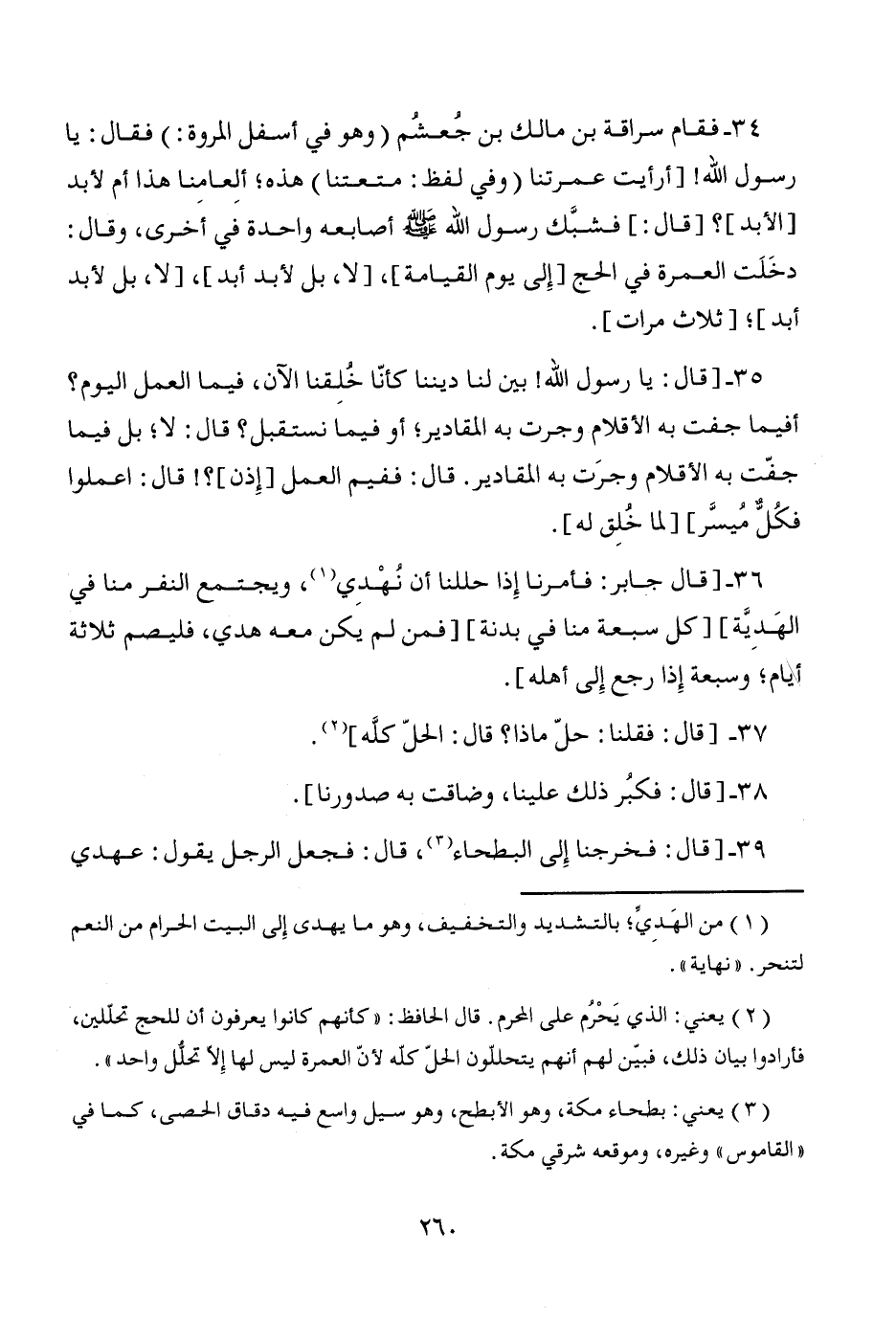 34 - فقام سراقة بن مالك بن جُعشُم (وهو في أسفل المروة:) فقال: يا رسول الله! [أرأيت عمرتنا (وفي لفظ: متعتنا) هذه؛ ألِعامِنا هذا أم لأبد [الأبد]؟ [قال:] فشبَّك رسول الله - صَلَّى اللَّهُ عَلَيْهِ وَسَلَّمَ - أصابعه واحدة في أخرى، وقال: دخَلَت العمرة في الحج [إِلى يوم القيامة]، [لا، بل لأبد أبد]، [لا، بل لأبد أبد]؛ [ثلاث مرات].