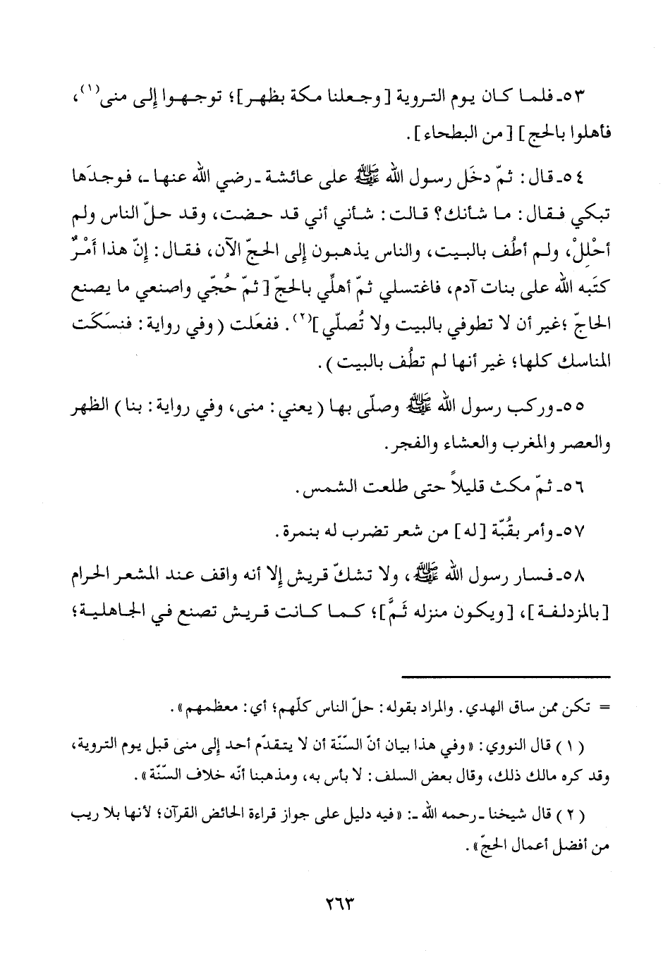 54 - قال: ثمّ دخَل رسول الله - صَلَّى اللَّهُ عَلَيْهِ وَسَلَّمَ - على عائشة -رضي الله عنها-، فوجدَها تبكي فقال: ما شأنك؟ قالتْ شأني أني قد حضت، وقد حلّ الناس ولم أحْلِلْ، ولم أطُف بالبيت، والناس يذهبون إِلى الحجّ الآن، فقال: إِنّ هذا أَمْرٌ كتَبه الله على بنات آدم، فاغتسلي ثمّ أهلِّي بالحجّ [ثمّ حُجّي واصنعي ما يصنع الحاجّ؛ غير أن لا تطوفي بالبيت ولا تُصلّي] (¬2). ففعَلت (وفي رواية: فنسَكَت المناسك كلها؛ غير أنها لم تطُف بالبيت).