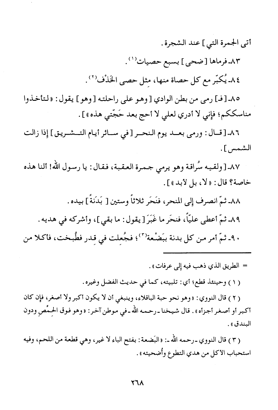 88 - ثمّ انصرف إِلى المنحر، فنَحَر ثلاثاً وستين [بَدَنةً] بيده.