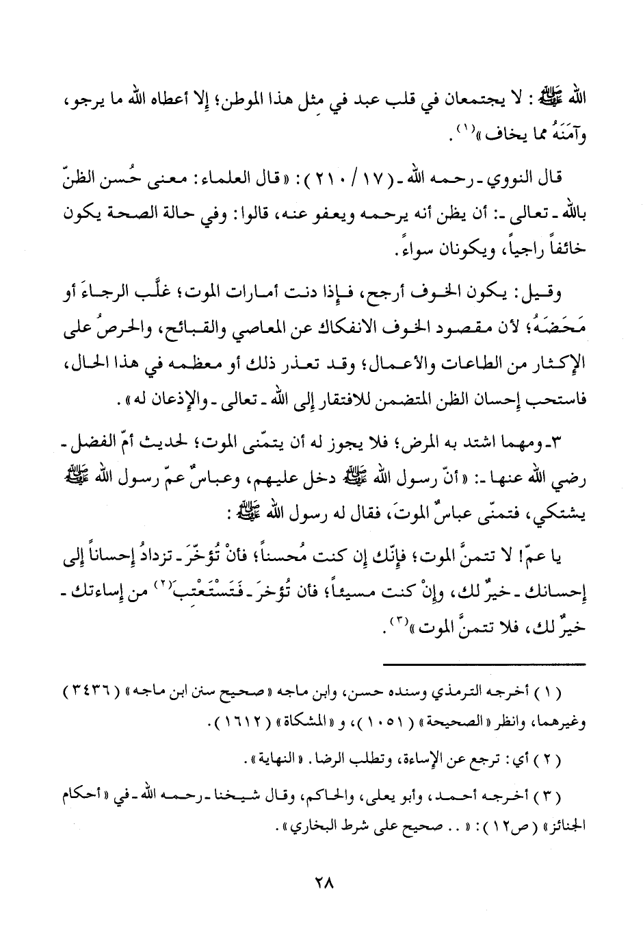 يا عمّ! لا تتمنَّ الموت؛ فإِنّك إِن كنت مُحسناً؛ فأنْ تُؤخّرَ -تزدادُ إِحساناً إِلى إِحسانك- خيرٌ لك، وإنْ كنت مسيئاً، فأن تُؤخرَ -فَتَسْتَعْتِبَ (¬2) من إِساءتك- خيرٌ لك، فلا تتمنَّ الموت" (¬3).