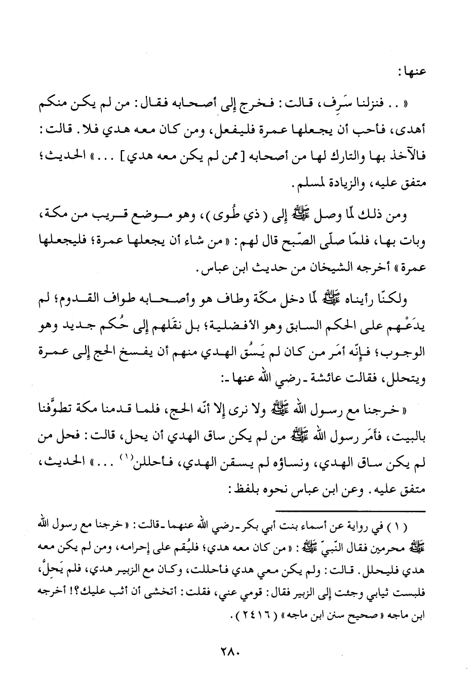 "خرجنا مع رسول الله - صَلَّى اللَّهُ عَلَيْهِ وَسَلَّمَ - ولا نرى إِلا أنّه الحج، فلما قدمنا مكة تطوَّفنا بالبيت، فأَمَر رسول الله - صَلَّى اللَّهُ عَلَيْهِ وَسَلَّمَ - من لم يكن ساق الهدي أن يحل، قالت: فحل من لم يكن ساق الهدي، ونساؤه لم يسقن الهدي، فأحللن (¬1)." الحديث، متفق عليه. وعن ابن عباس نحوه بلفظ:
