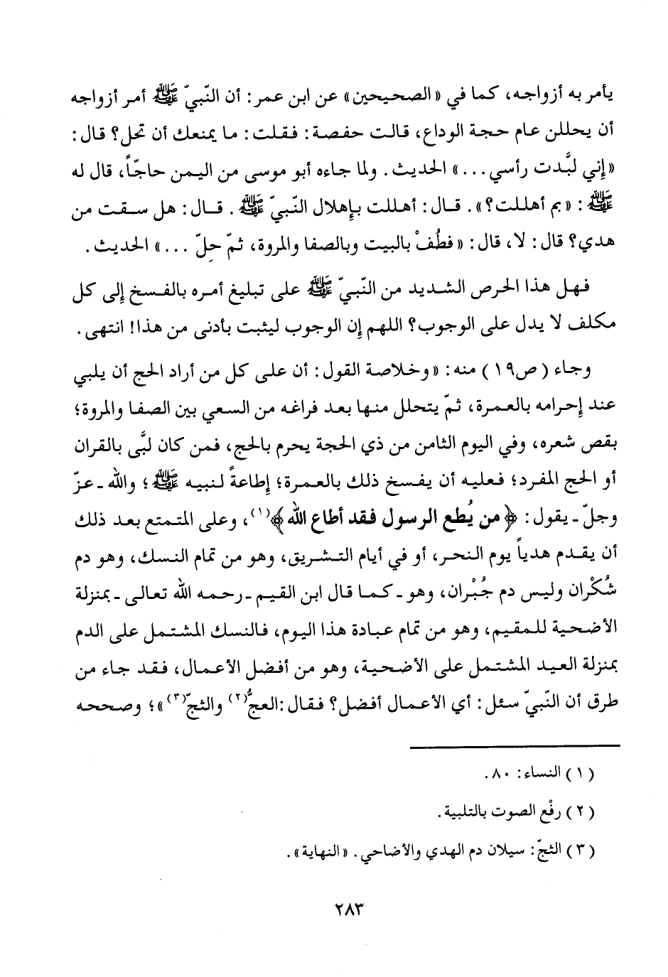وجاء (ص 19) منه: "وخلاصة القول: أن على كل من أراد الحج أن يلبي عند إِحرامه بالعمرة، ثمّ يتحلل منها بعد فراغه من السعي بين الصفا والمروة؛ بقص شعره، وفي اليوم الثامن من ذي الحجة يحرم بالحج، فمن كان لبَّى بالقران أو الحج المفرد؛ فعليه أن يفسخ ذلك بالعمرة؛ إِطاعةً لنبيه - صَلَّى اللَّهُ عَلَيْهِ وَسَلَّمَ -؛ والله -عزّ وجلّ- يقول: {من يُطع الرسول فقد أطاع الله} (¬1)، وعلى المتمتع بعد ذلك أن يقدم هدياً يوم النحر، أو في أيام التشريق، وهو من تمام النسك، وهو دم شُكْران وليس دم جُبْران، وهو -كما قال ابن القيم -رحمه الله تعالى- بمنزلة الأضحية للمقيم، وهو من تمام عبادة هذا اليوم، فالنسك المشتمل على الدم بمنزلة العيد المشتمل على الأضحية، وهو من أفضل الأعمال، فقد جاء من طرق أن النّبيّ سئل: أي الأعمال أفضل؟ فقال: العجُّ (¬2) والثجّ (¬3)؛ وصححه