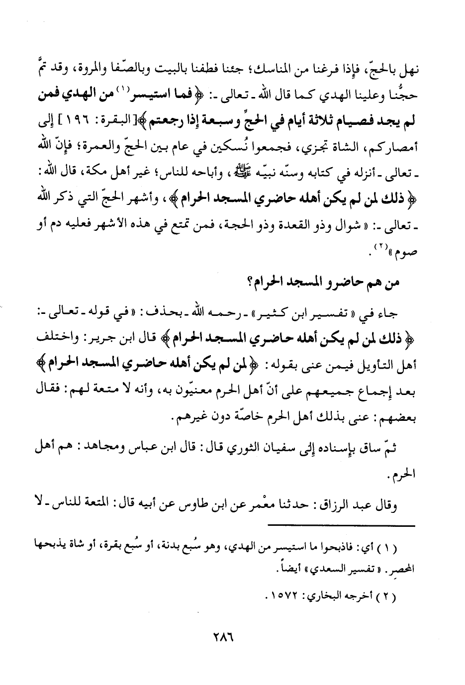 جاء في "تفسير ابن كثير" -رحمه الله- بحذف: "في قوله -تعالى-: {ذلك لمن لم يكن أهله حاضري المسجد الحرام} قال ابن جرير: واختلف أهل التأويل فيمن عنى بقوله: {لمن لم يكن أهله حاضري المسجد الحرام} بعد إجماع جميعهم على أنّ أهل الحرم معنيّون به، وأنه لا متعة لهم: فقال بعضهم: عنى بذلك أهل الحرم خاصّة دون غيرهم.